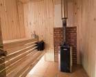 Первый этаж: кухня: газовая варочная 4-х конфорочная панель, двухкамерный холодильник, вытяжка, микроволновая печь, обеденный стол; гостиная с камином: телевизор, диван, пуф, журнальный столик; спальная комната: двуспальная кровать, две прикроватные тумбы, шкаф-купе; ванная комната с душевой кабиной, санузел; баня. Второй этаж: спальная комната- две односпальные кровати с прикроватными тумбочками.