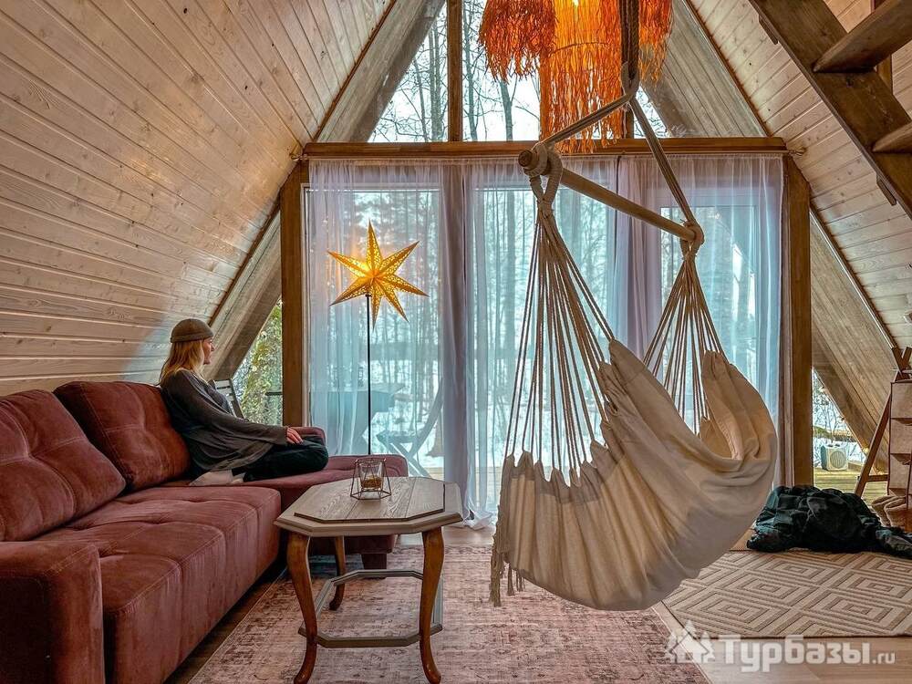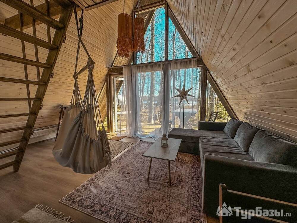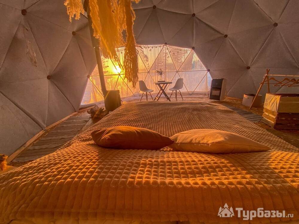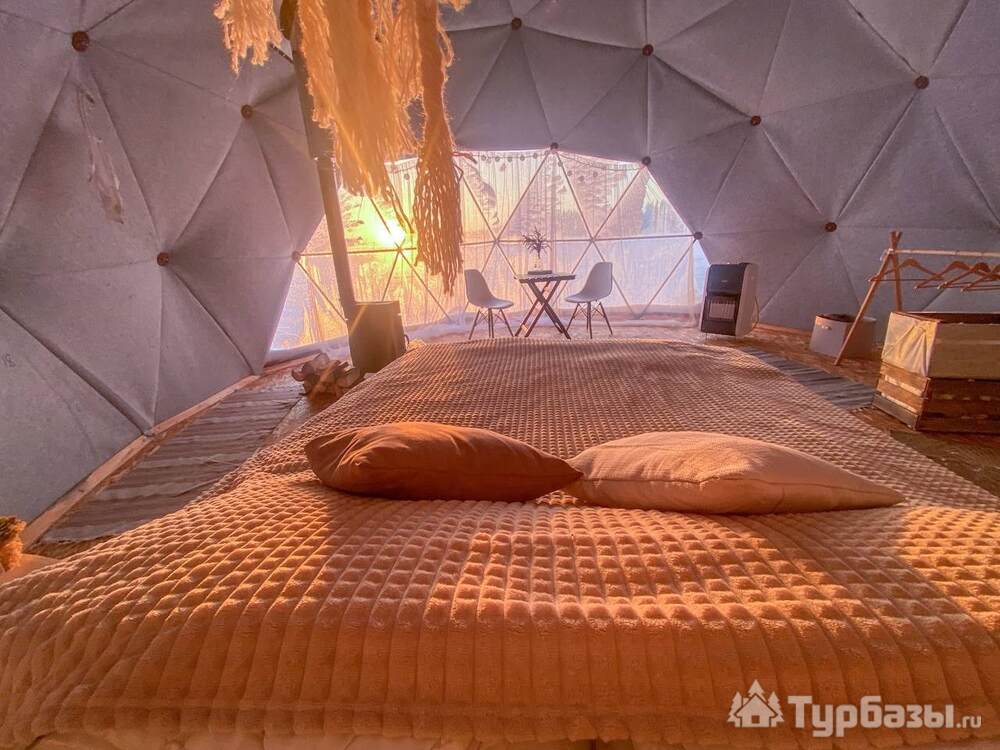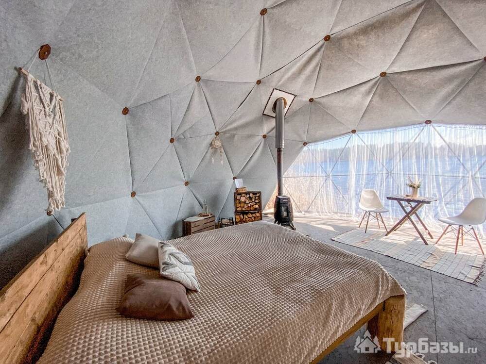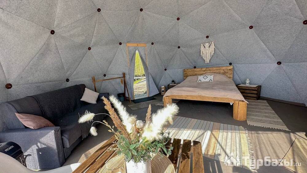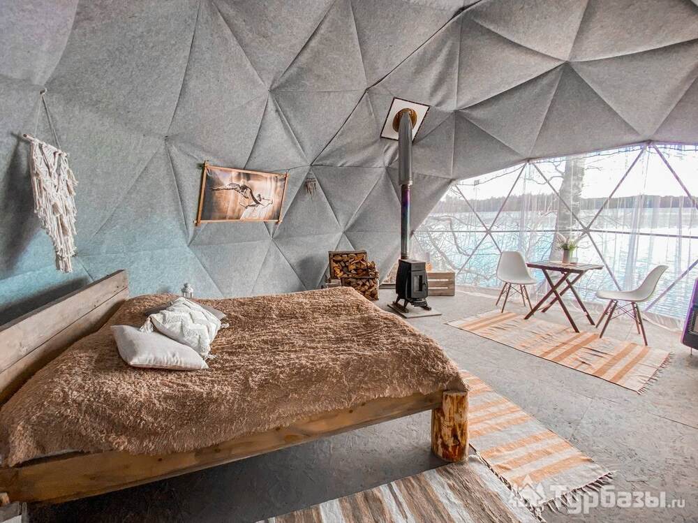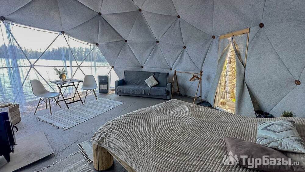 На территории представлены три основных формата жилья — A-Frame домики, safari-lodges и купольные «соты»/домики-сферы. Все юниты спроектированы для круглогодичного использования: тёплые полы, уютные спальни, террасы с видом на озеро и у многих — собственная лаунж-зона. Вместимость комплекса позволяет принять до ~45 гостей одновременно, поэтому объект хорошо подходит как для романтического отдыха, так и для небольших компаний.