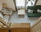 На первом этаже расположена зона отдыха, а также спальная зона с двуспальной кроватью.