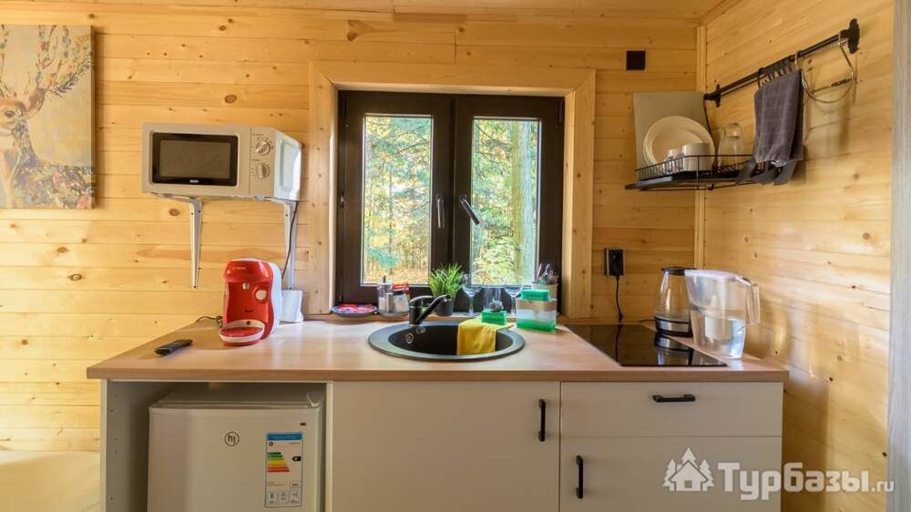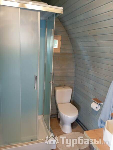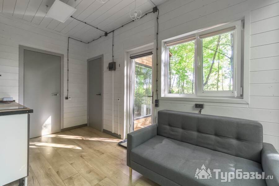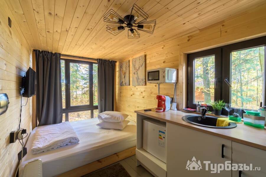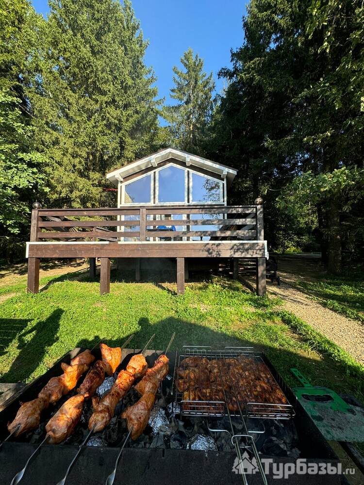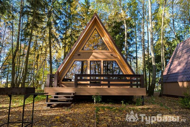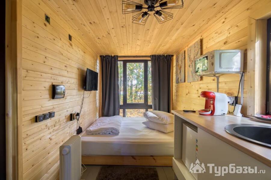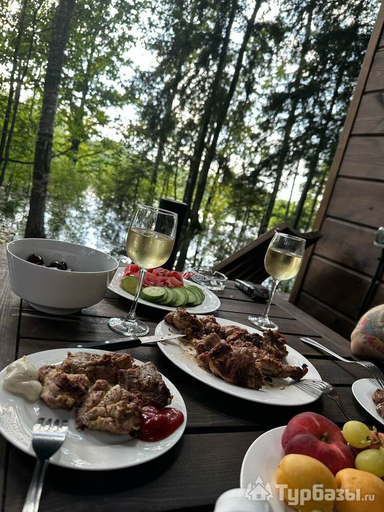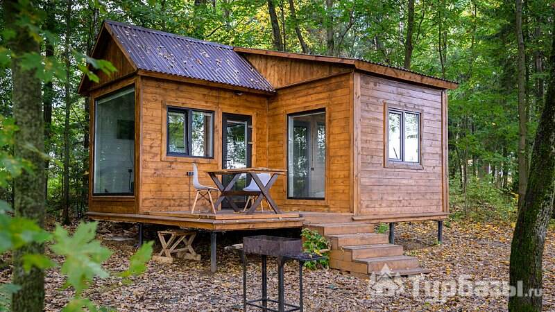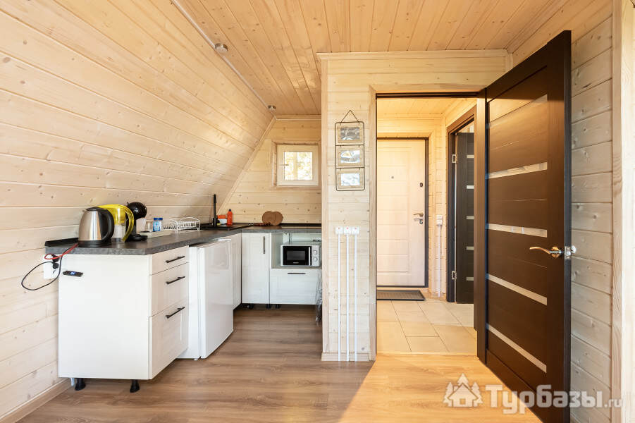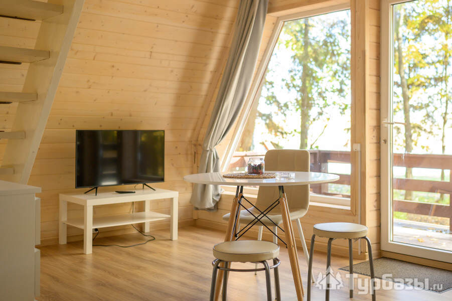 На базе — несколько типов домиков (одно- и двухэтажные, A-frame и эко-домики) с кухнями или мини-кухнями, террасами и панорамными окнами; рядом — парковка и оборудованные места для барбекю. Для любителей парной действует баня у воды (аренда возможна поминутно/по сеансам). Готовят и завтраки по заказу.