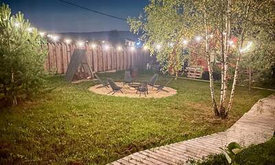 Здесь не будет развлекательной шоу-программы — зато будут прогулки по лесу, вечерние разговоры на террасе, купель под звёздами и самостоятельные экскурсии по окрестным фермам. Можно заказать доставку еды или договориться о завтраках заранее; мангал и печь для казана доступны, уголь и дрова можно приобрести на месте.
