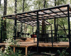 На территории — десять домиков скандинавского типа с большими окнами и собственной верандой; в каждом есть всё необходимое для круглогодичного отдыха: кровать, мини-кухня, уютная зона для отдыха. Домики проектировались из морских контейнеров — им дали «вторую жизнь», сохранив при этом практичность и экологичность.