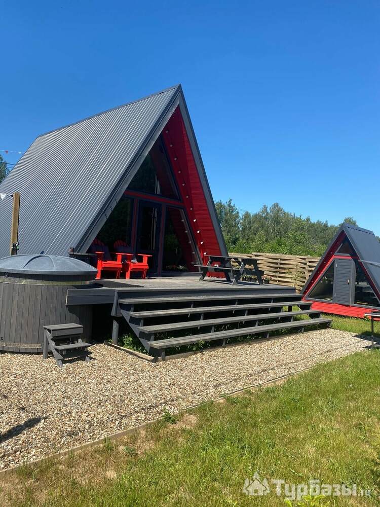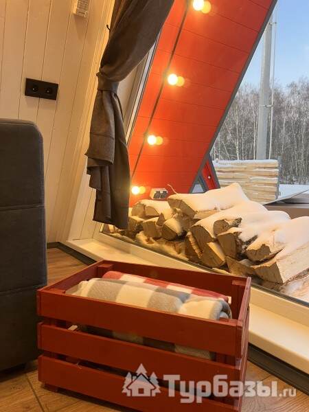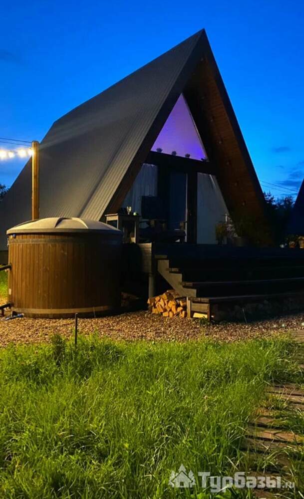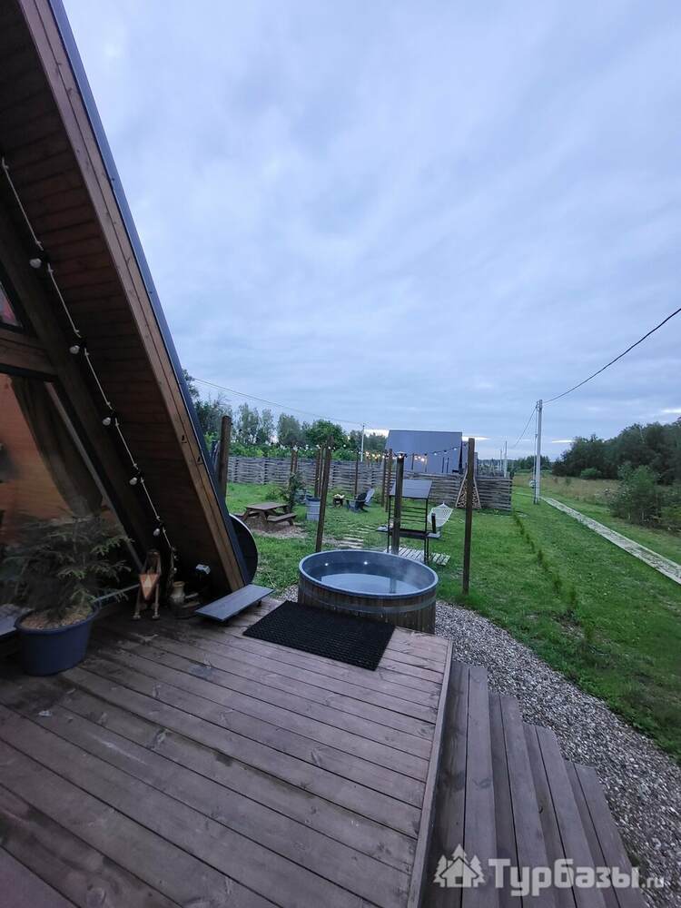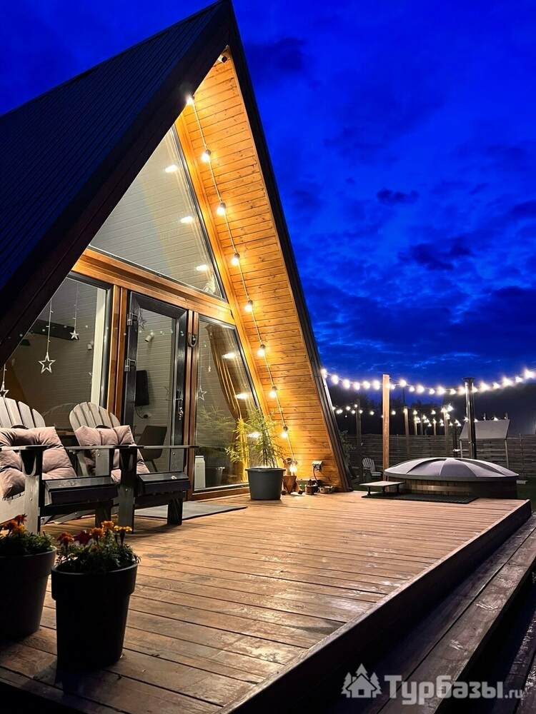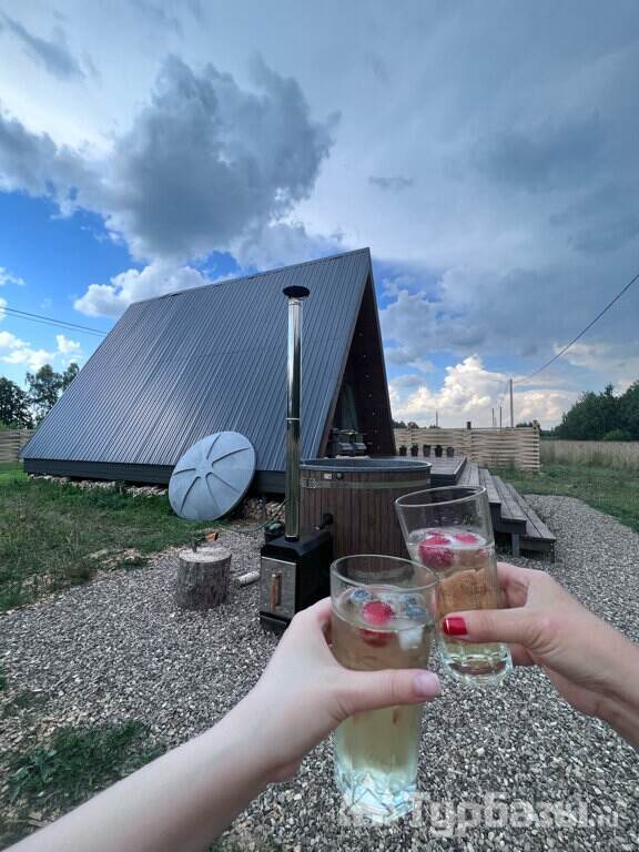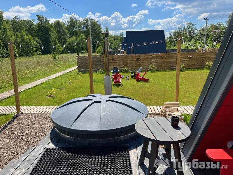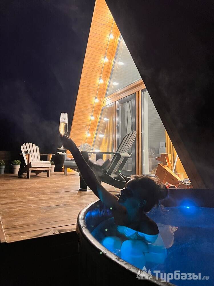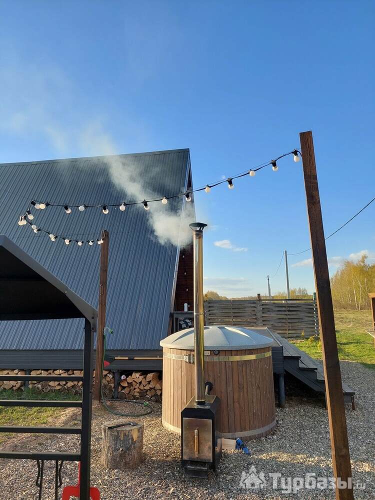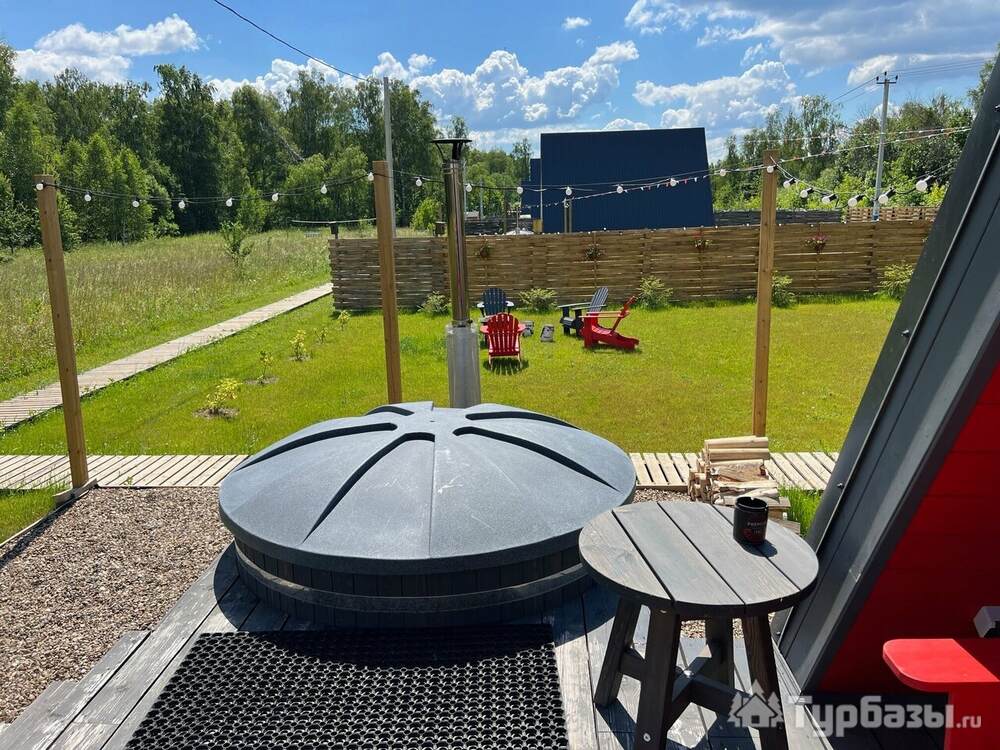 Каждый A-домик оборудован для комфортного проживания: меблированная терраса, отопление, кондиционер, чай/кофе, холодильник, микроволновка и посуда — всё для спокойного самообслуживания. На террасе многих домиков стоит подогреваемая купель, а на территории есть общая костровая зона, мангал и наборы для пикника. Для любителей парной — дровяная баня с веником и набором травяных чаёв.
