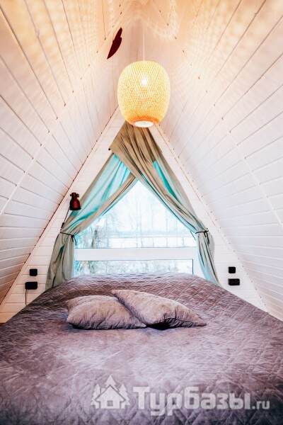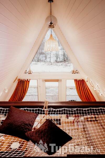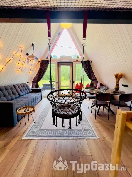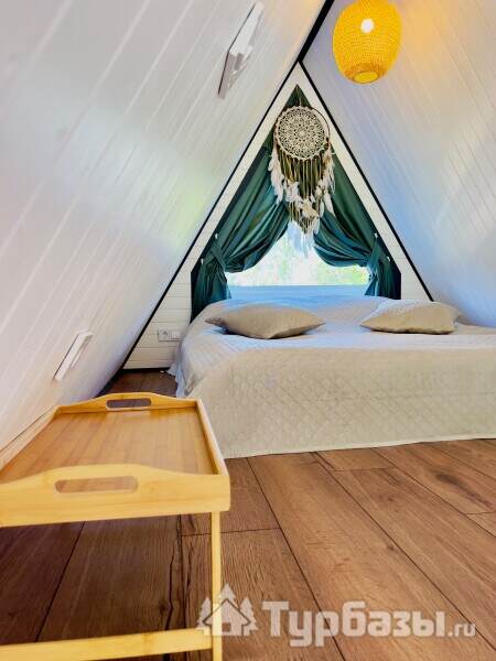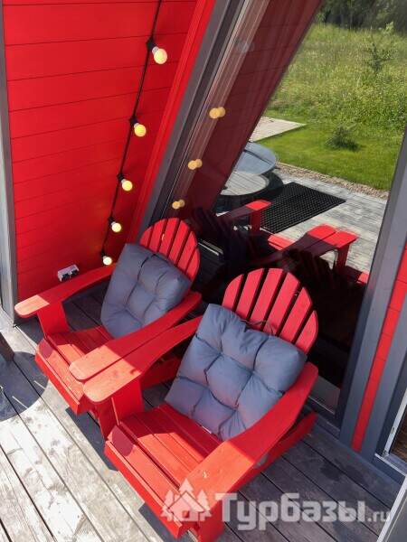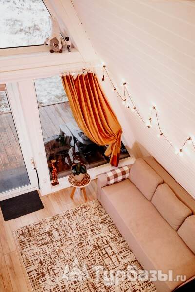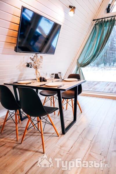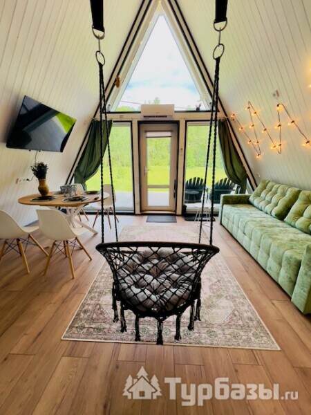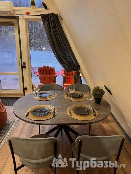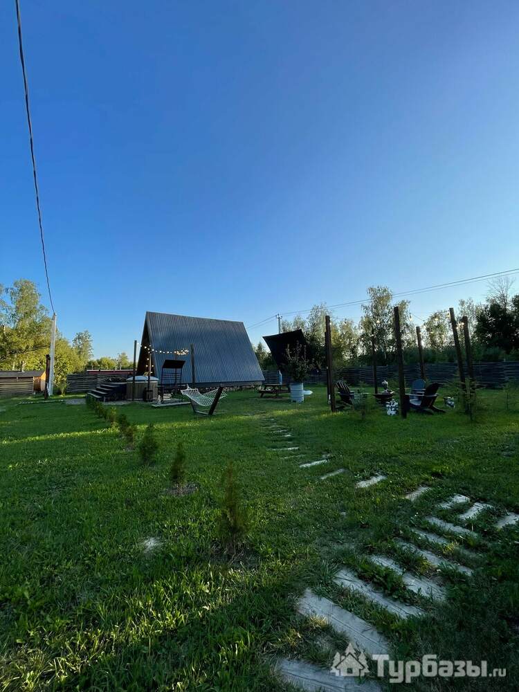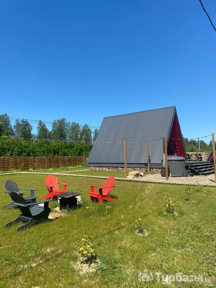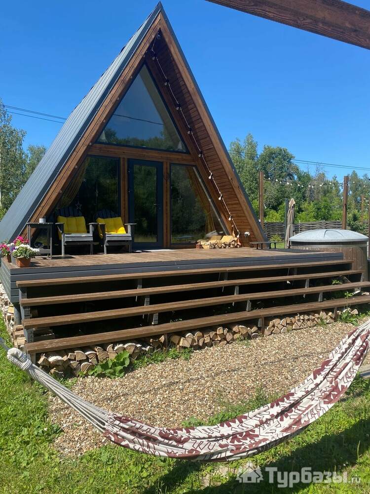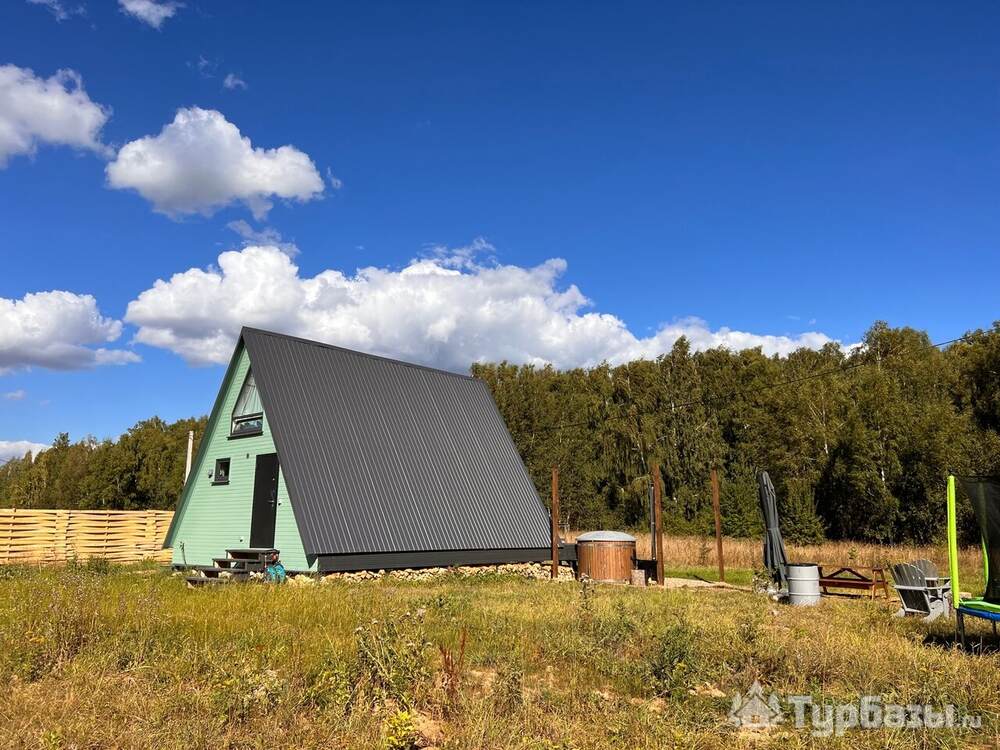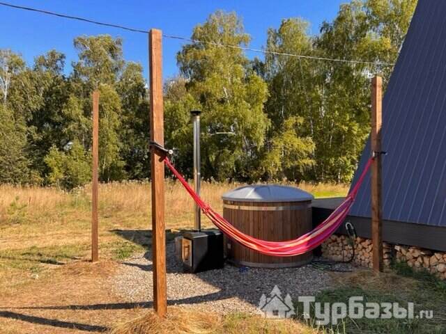 Каждый A-домик оборудован для комфортного проживания: меблированная терраса, отопление, кондиционер, чай/кофе, холодильник, микроволновка и посуда — всё для спокойного самообслуживания. На террасе многих домиков стоит подогреваемая купель, а на территории есть общая костровая зона, мангал и наборы для пикника. Для любителей парной — дровяная баня с веником и набором травяных чаёв.