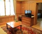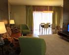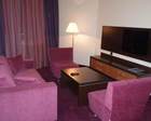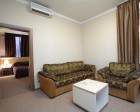 Оснащение: двуспальная кровать, диван, прикроватные тумбочки, туалетный столик, стул, журнальный столик, кресла, гардеробный шкаф, вешалки, телевизионная тумба, ковровое покрытие, балкон, ЖК-телевизор, спутниковое телевидение. мини-холодильник, телефон, интернет (проводной), чайник, посуда, санузел с душем, туалетные принадлежности, фен.
