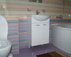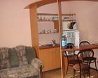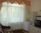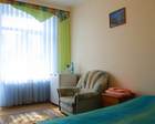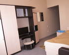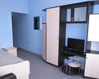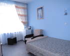 В каждом номере две комнаты - спальня и гостиная. В спальне: одна двухспальная кровать, две прикроватные тумбочки, шкаф. В гостиной: раскладывающийся диван, кухонный гарнитур, барная стойка, микроволновая печь, журнальный столик, холодильник, телевизор, чайник, телефон. В ванной комнате угловая ванна, унитаз, раковина, фен.