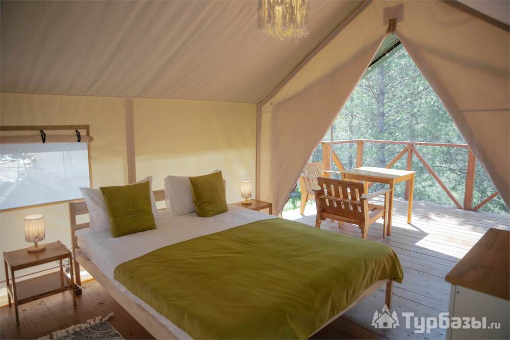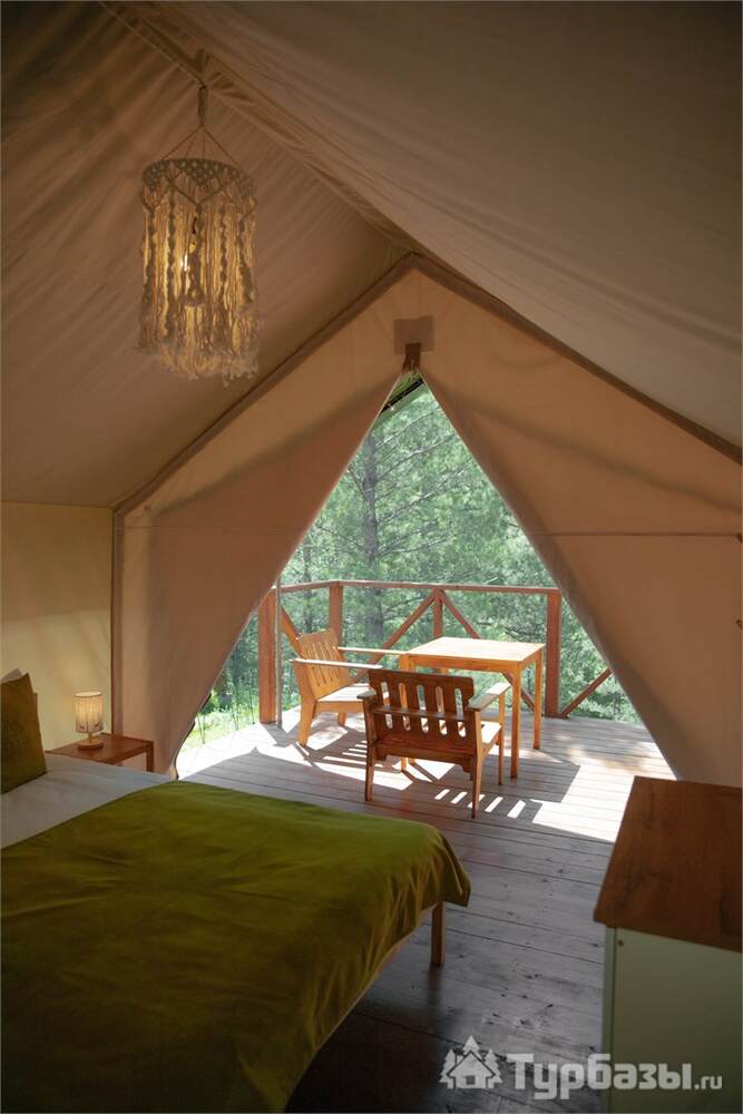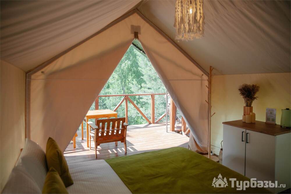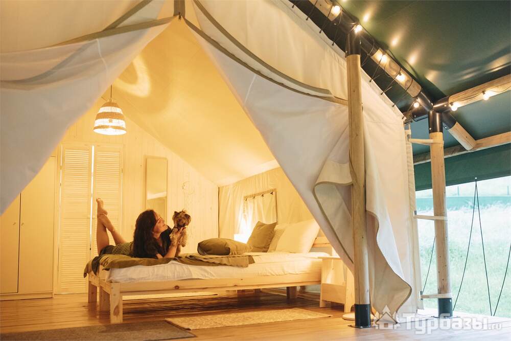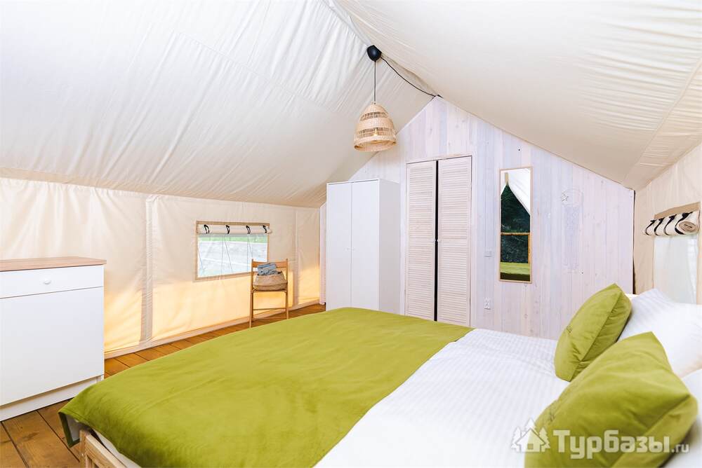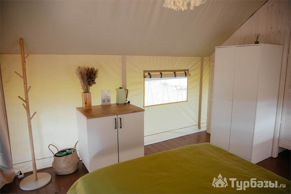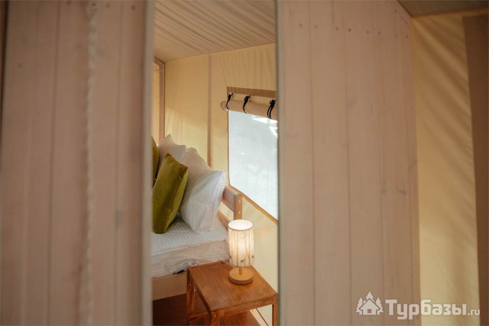 На территории — шесть (летних) сафари-тентов и круглогодичное шале A-frame, все с индивидуальными террасами и видом на воду. Номера оборудованы «как в отеле»: мягкие кровати, личный санузел, тёплые полы в шале и места для вечернего барбекю на собственной террасе. Завтраки и романтические ужины — часть сервисной культуры глэмпинга. Интерьер палаток выдержан в натуральной, спокойной палитре.