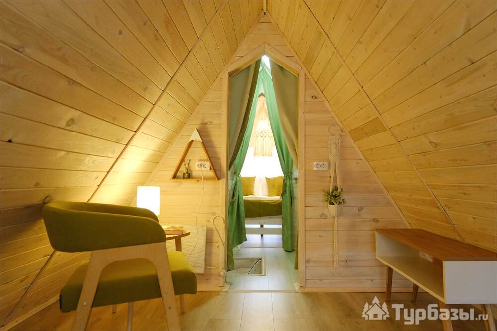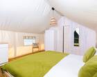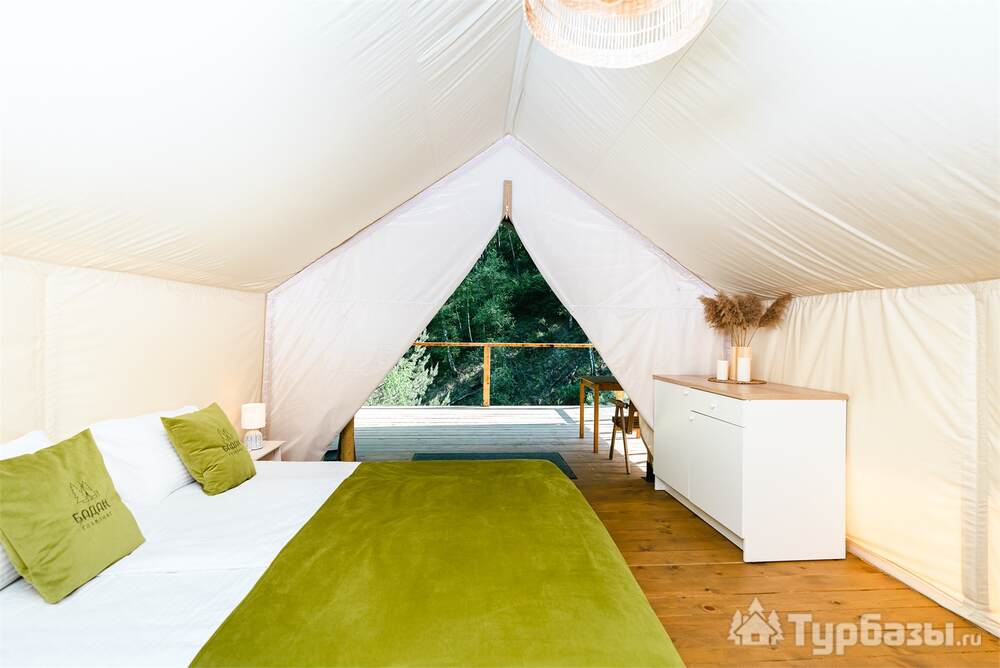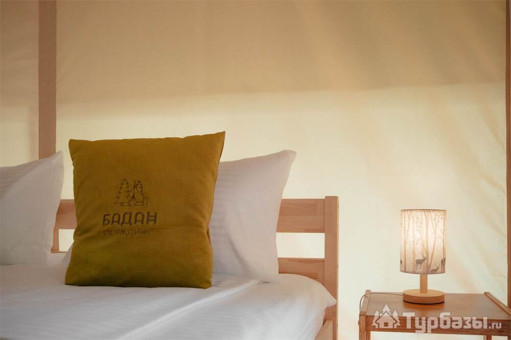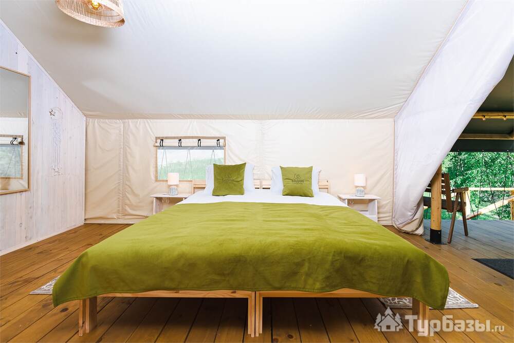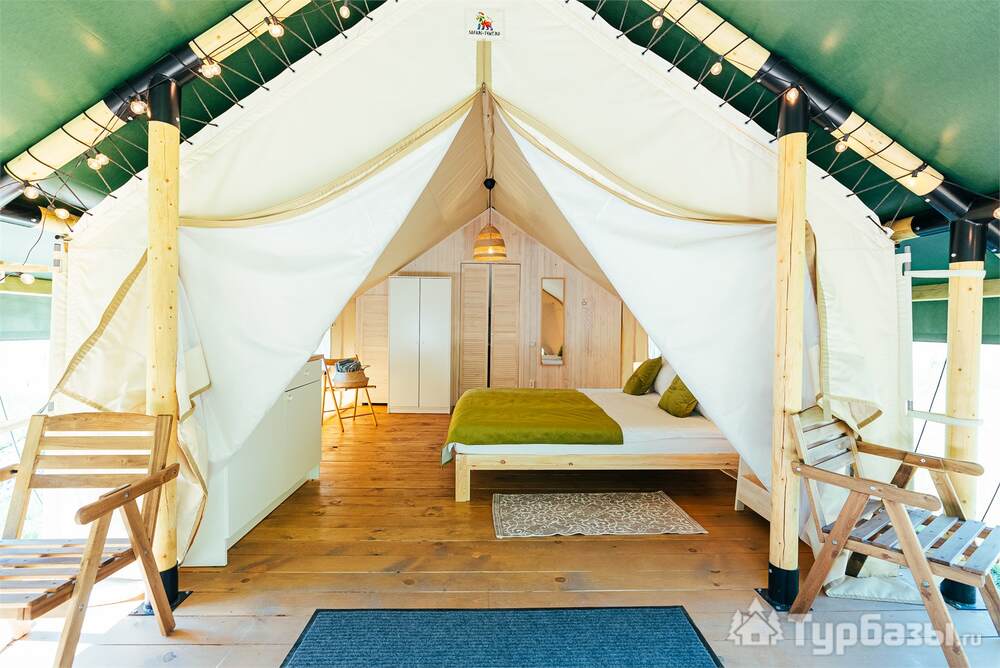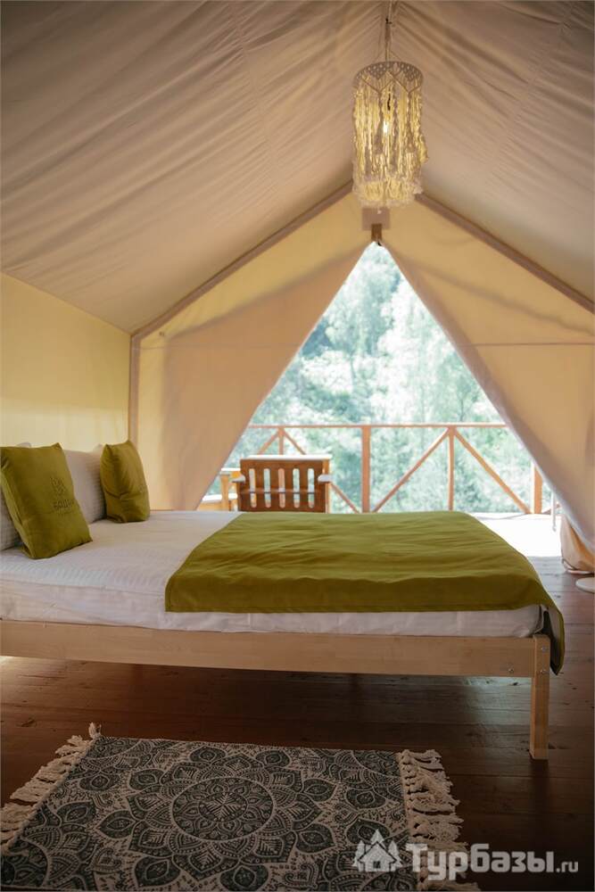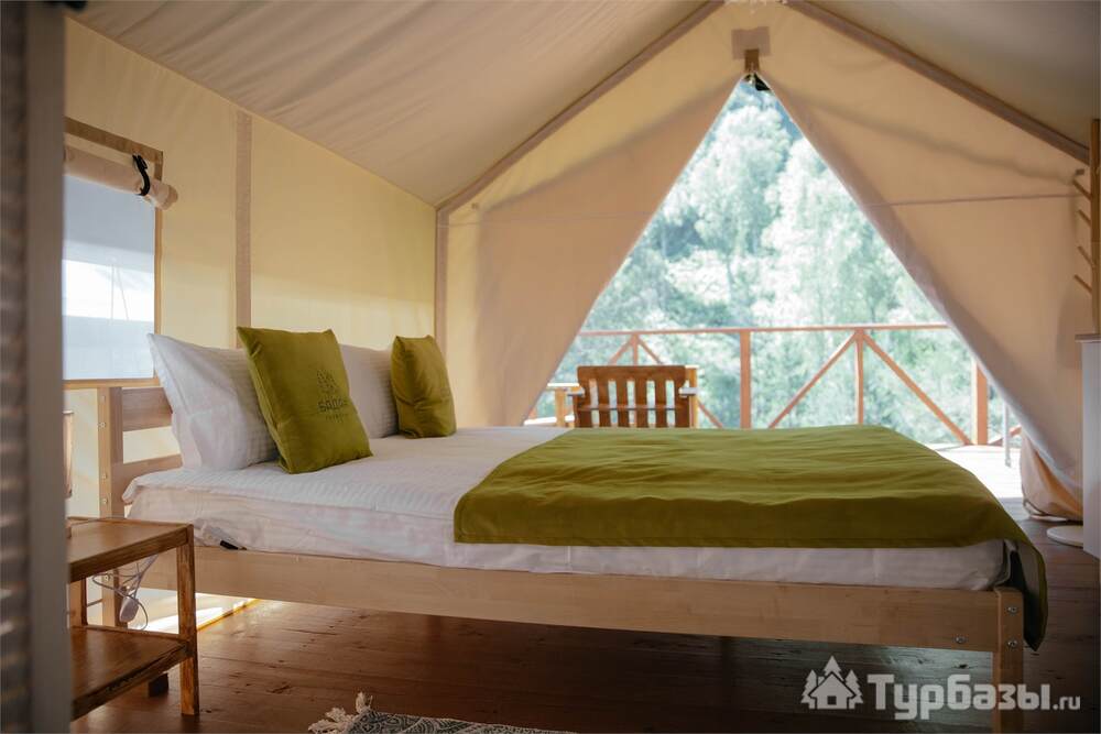 На территории — шесть (летних) сафари-тентов и круглогодичное шале A-frame, все с индивидуальными террасами и видом на воду. Номера оборудованы «как в отеле»: мягкие кровати, личный санузел, тёплые полы в шале и места для вечернего барбекю на собственной террасе. Завтраки и романтические ужины — часть сервисной культуры глэмпинга. Интерьер палаток выдержан в натуральной, спокойной палитре.