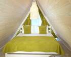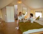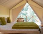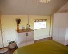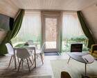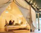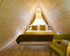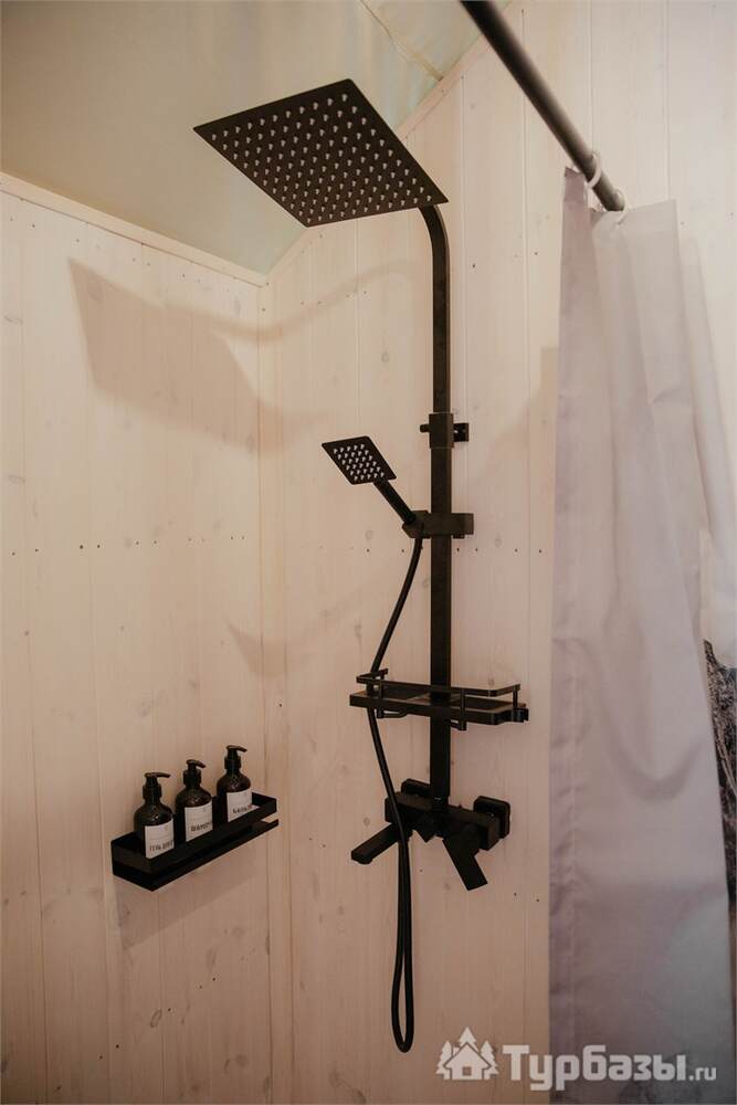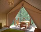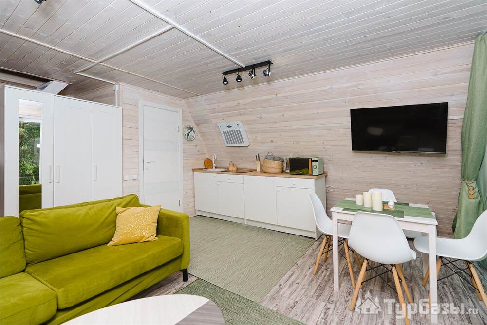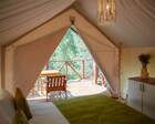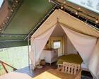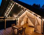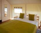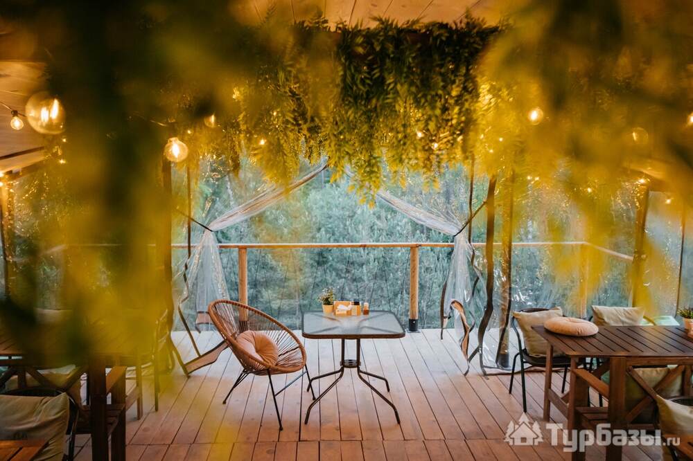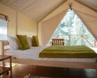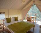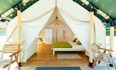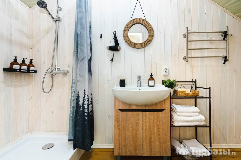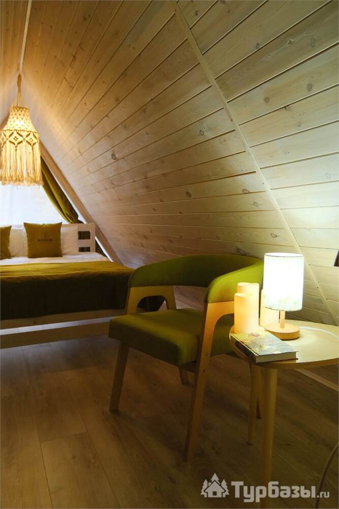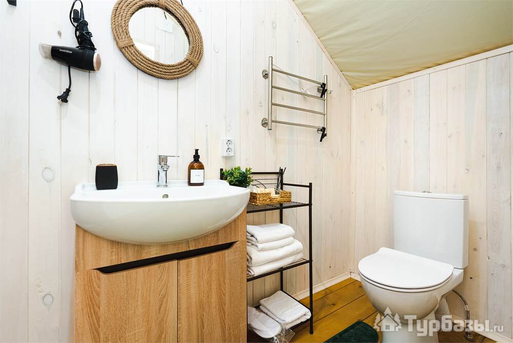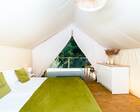 На территории — шесть (летних) сафари-тентов и круглогодичное шале A-frame, все с индивидуальными террасами и видом на воду. Номера оборудованы «как в отеле»: мягкие кровати, личный санузел, тёплые полы в шале и места для вечернего барбекю на собственной террасе. Завтраки и романтические ужины — часть сервисной культуры глэмпинга. Интерьер палаток выдержан в натуральной, спокойной палитре.