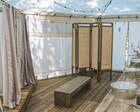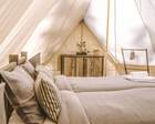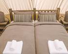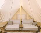 Лагерь предусматривает одновременное размещение 14 человек. 6 устойчивых палаток из брезента, не ограничивающих пространство (24 кв. метра), установлены на площадке из дерева лиственных пород. Между палатками предусмотрено расстояние, обеспечивающее гостям тишину и покой.