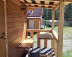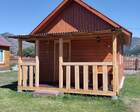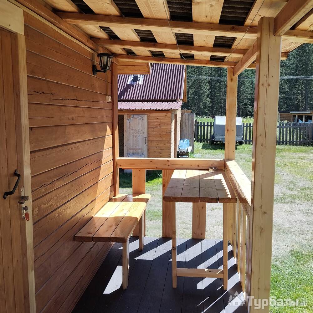 Также в домике обеденная зона, чайник, холодильник, телевизор, веранда со столом и лавкой, мангал у домика.