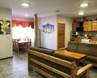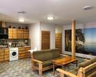 Уютная холл-гостиная 50 м2, где есть три стола 3х4, кухонный гарнитур, два мягких трехместных дивана, журнальный столик, посуда, электрочайник, микроволновая печь, стиральная машина, холодильник, ЖК телевизор 43".