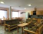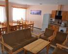 Просторная холл-гостиная 50 м2, где есть три стола 3х4, кухонный гарнитур, два мягких трехместных дивана, журнальный столик, посуда, электрочайник, микроволновая печь, стиральная машина, холодильник, ЖК телевизор 43".