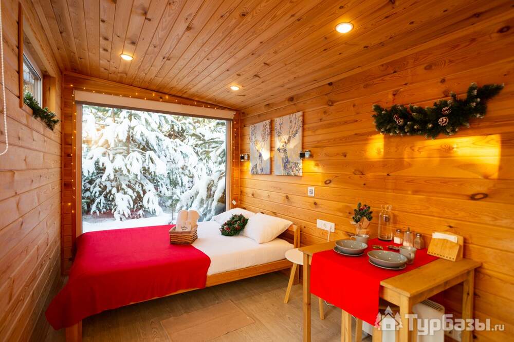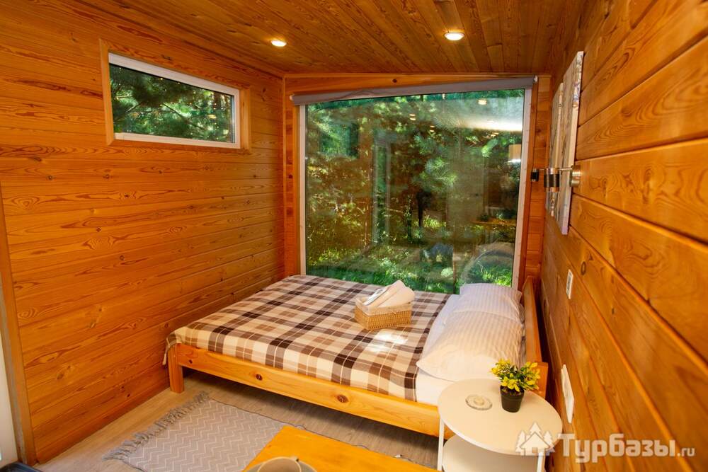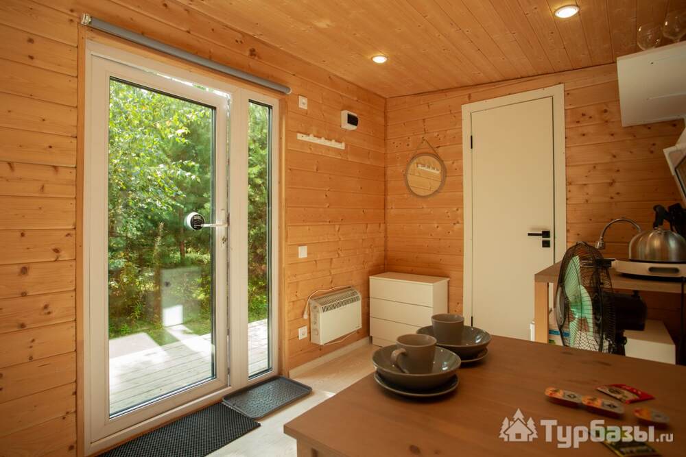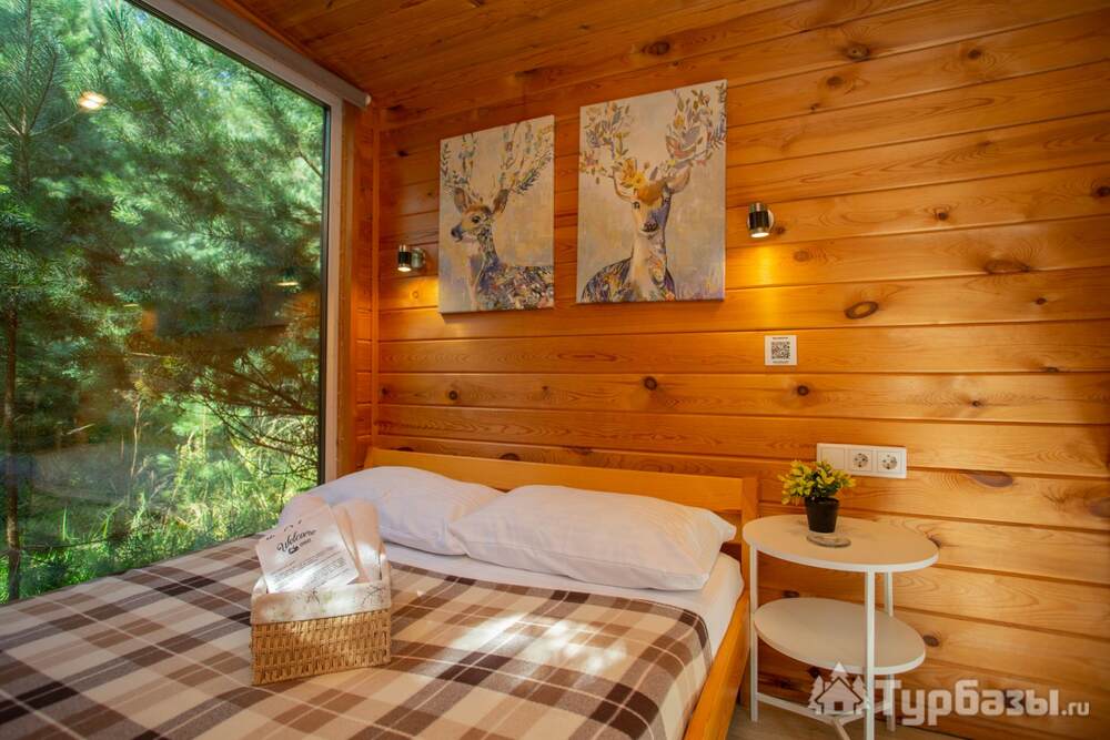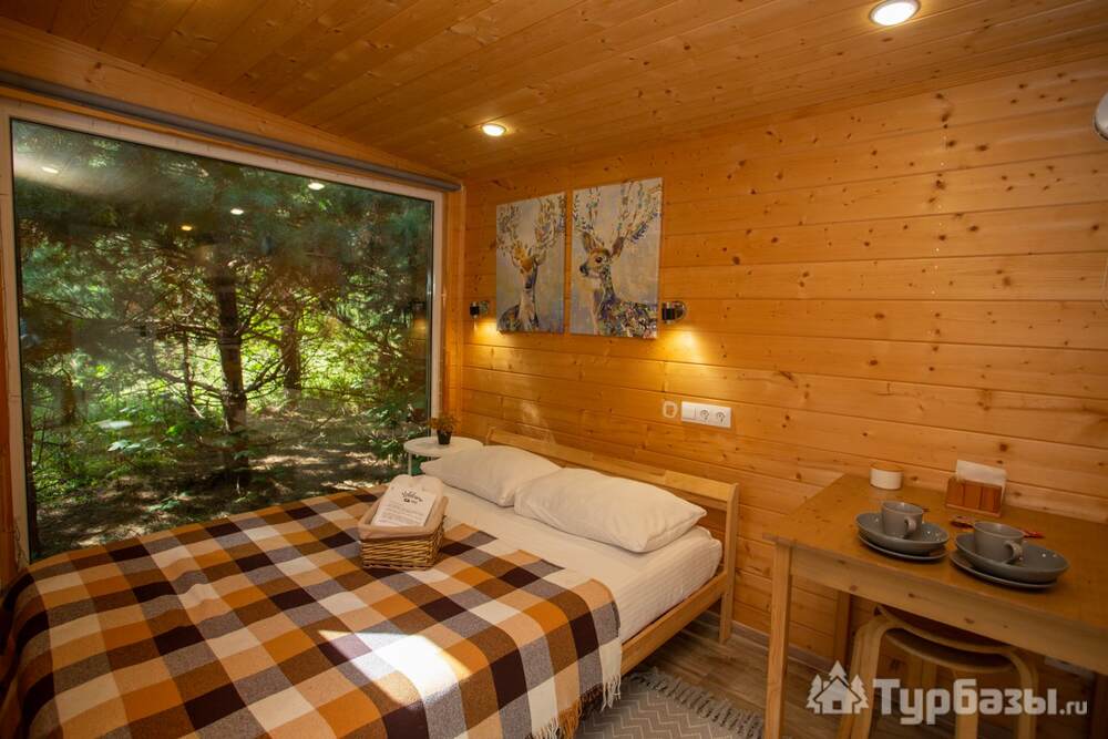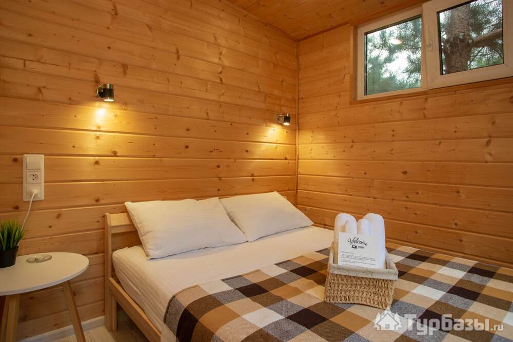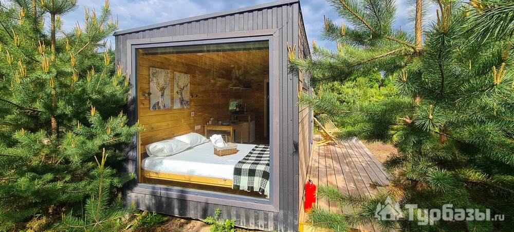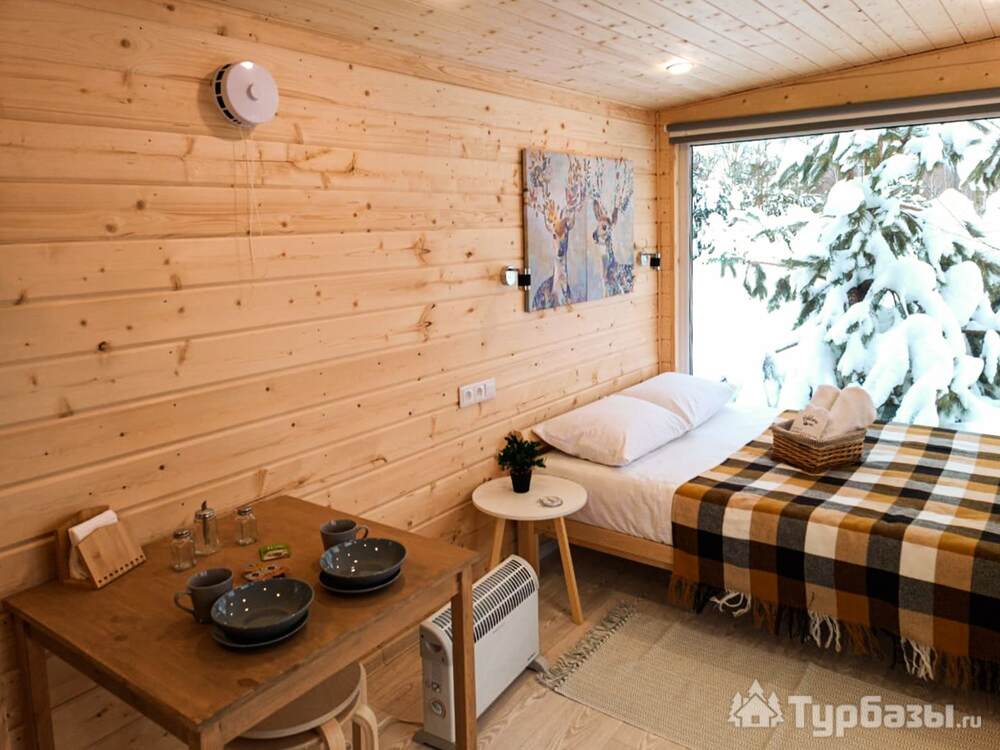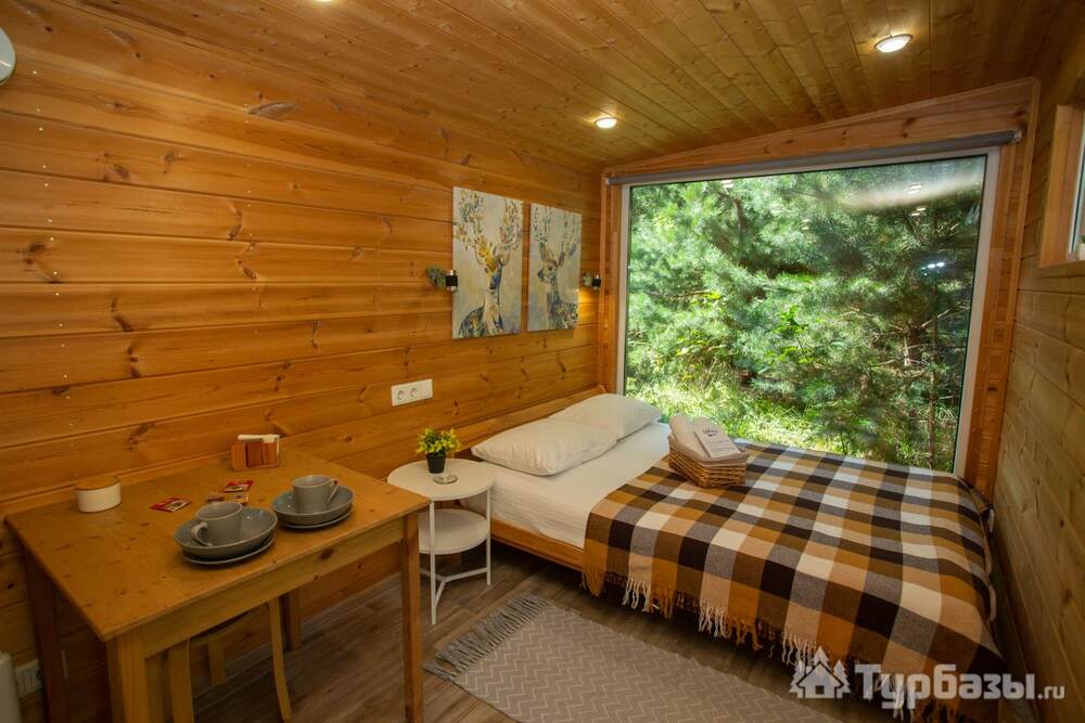 На базе — серия компактных «скандинавских» домиков (одно- и двухмодульные форматы): каждое жильё имеет отделку из дерева, с кухонным уголком, двуспальной кроватью и панорамным окном, через которое видна лесная полянка. Интерьеры тёплые и минималистичные — хороши для пар и небольших семей.