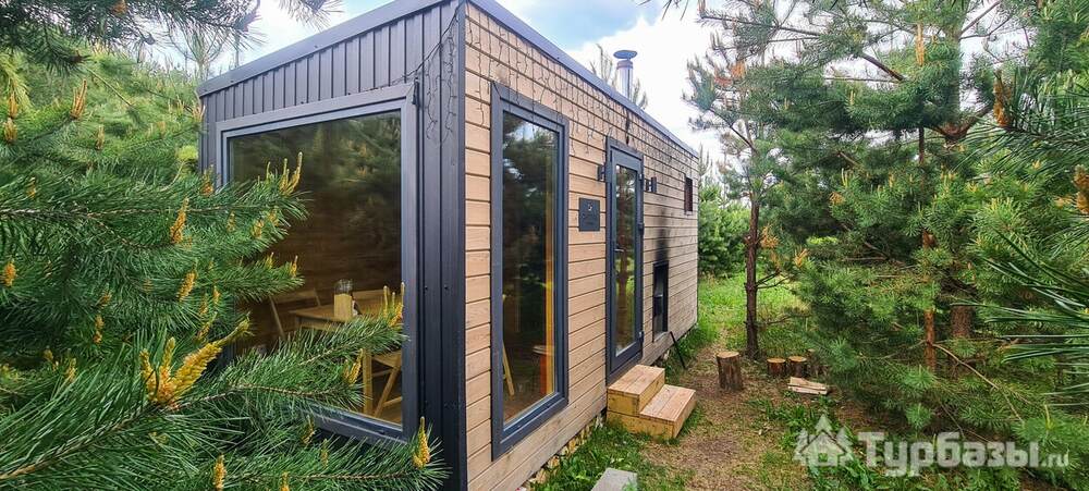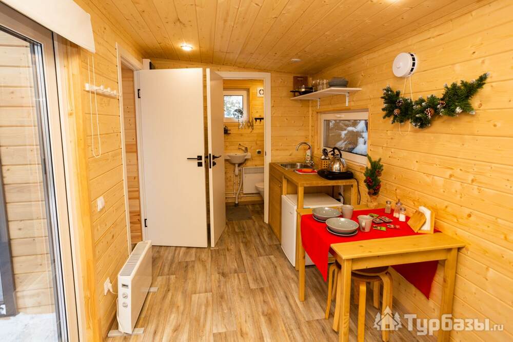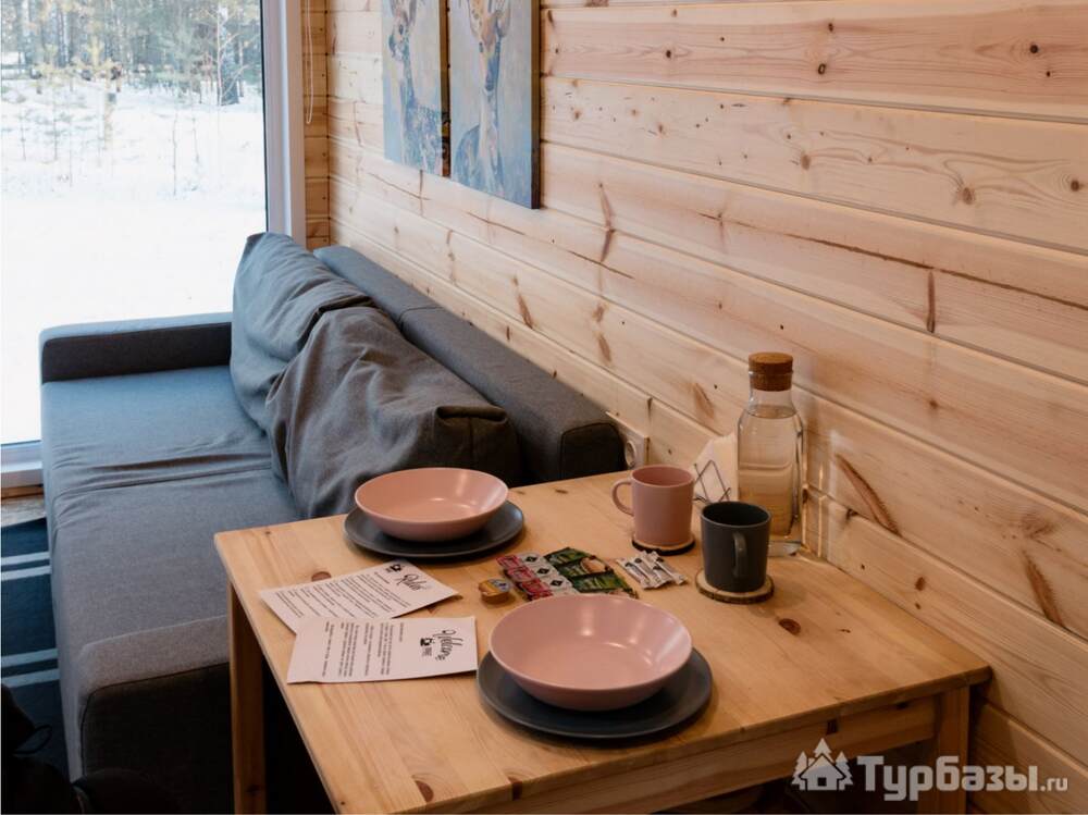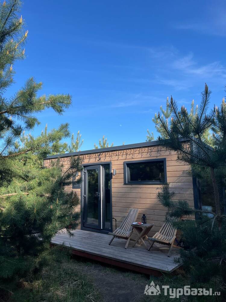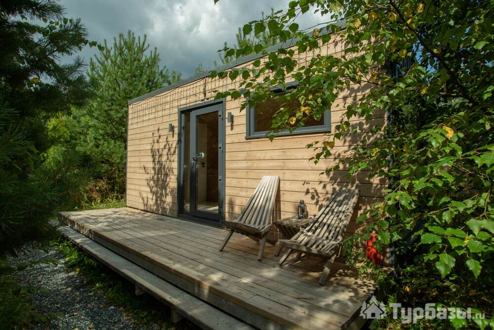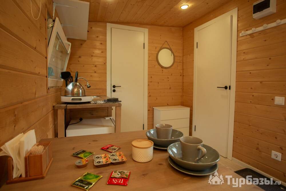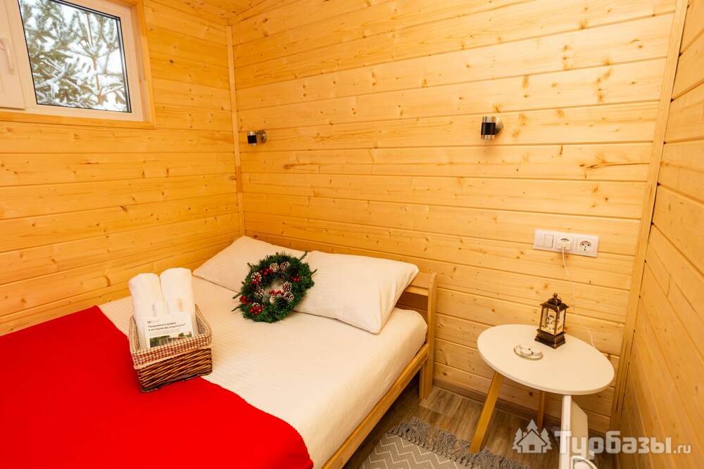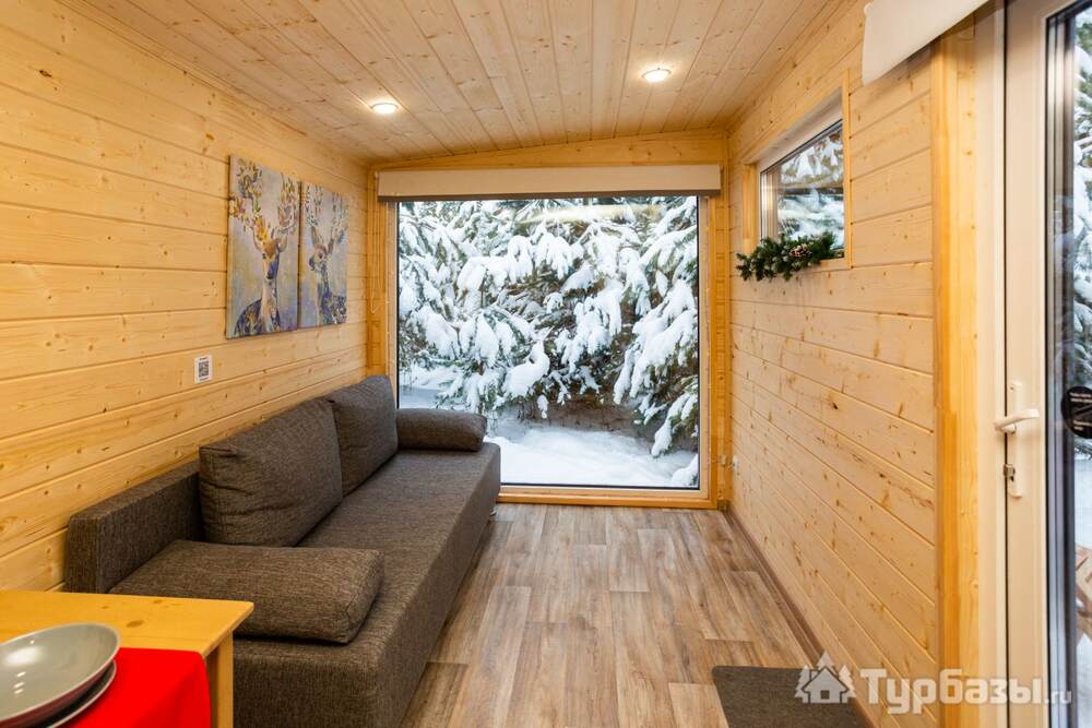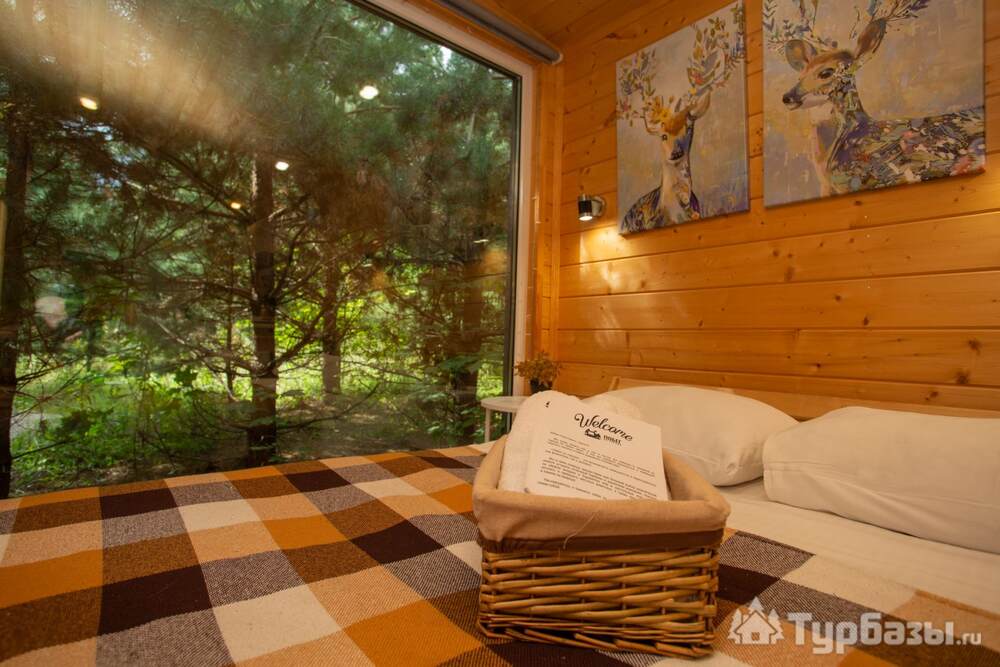 На базе — серия компактных «скандинавских» домиков (одно- и двухмодульные форматы): каждое жильё имеет отделку из дерева, с кухонным уголком, двуспальной кроватью и панорамным окном, через которое видна лесная полянка. Интерьеры тёплые и минималистичные — хороши для пар и небольших семей.