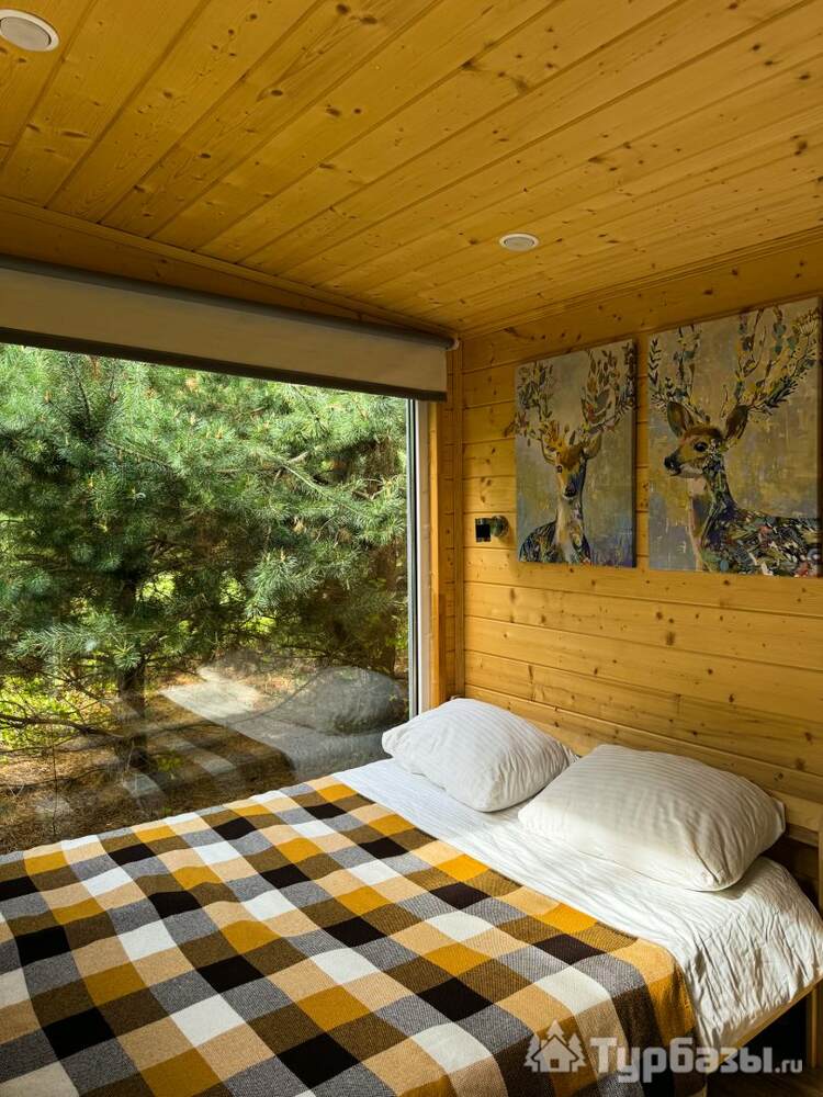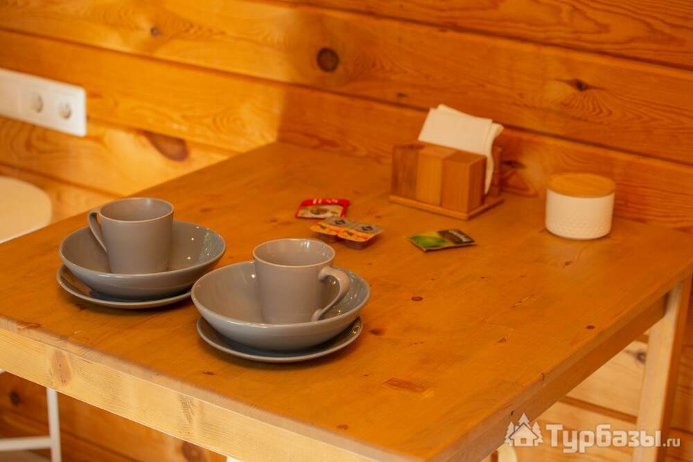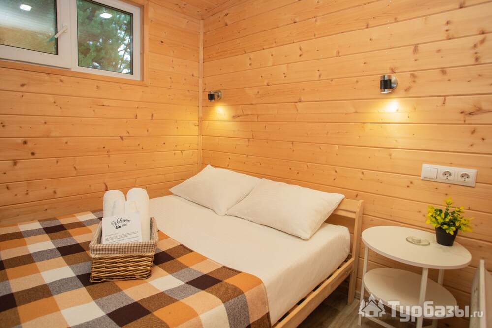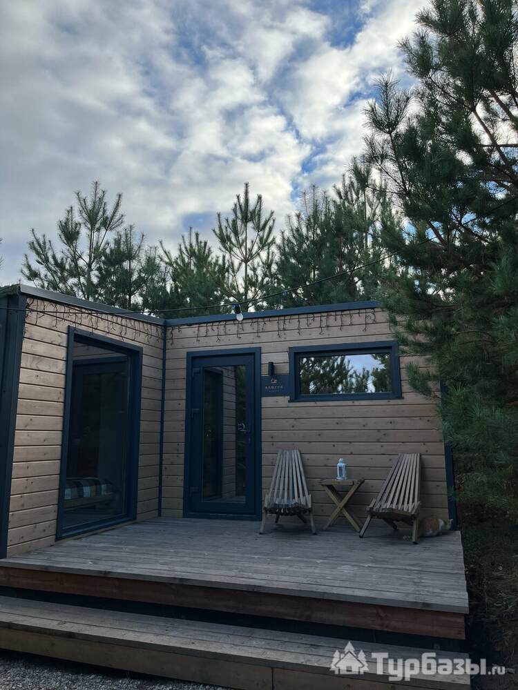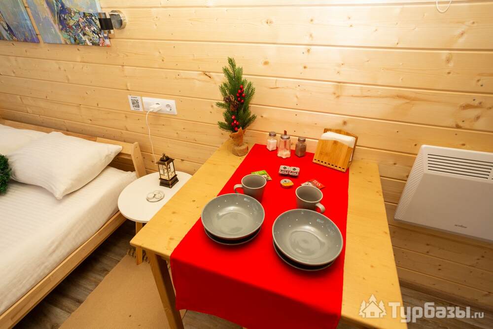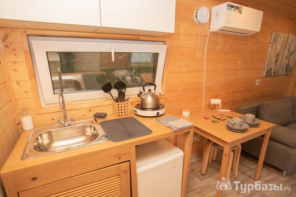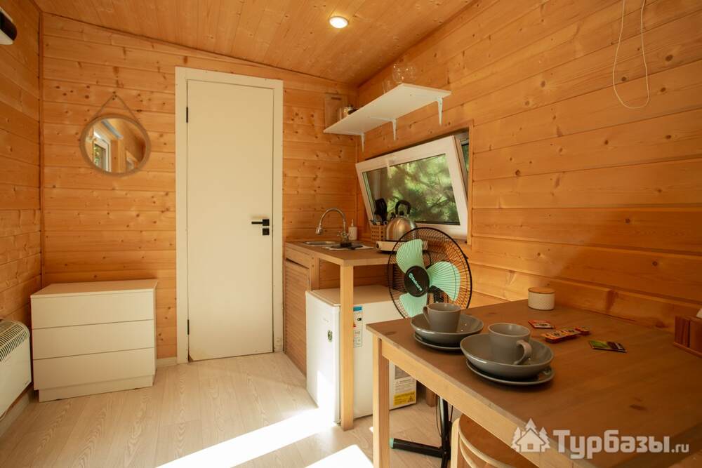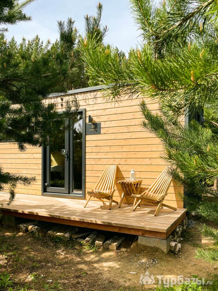 На базе — серия компактных «скандинавских» домиков (одно- и двухмодульные форматы): каждое жильё имеет отделку из дерева, с кухонным уголком, двуспальной кроватью и панорамным окном, через которое видна лесная полянка. Интерьеры тёплые и минималистичные — хороши для пар и небольших семей.