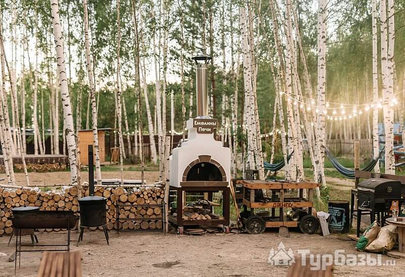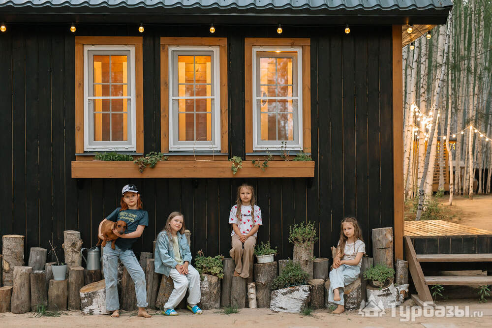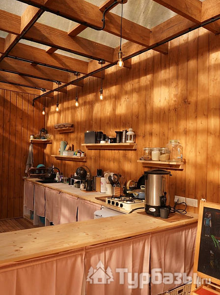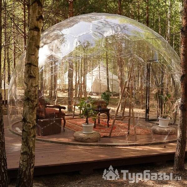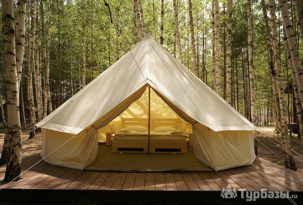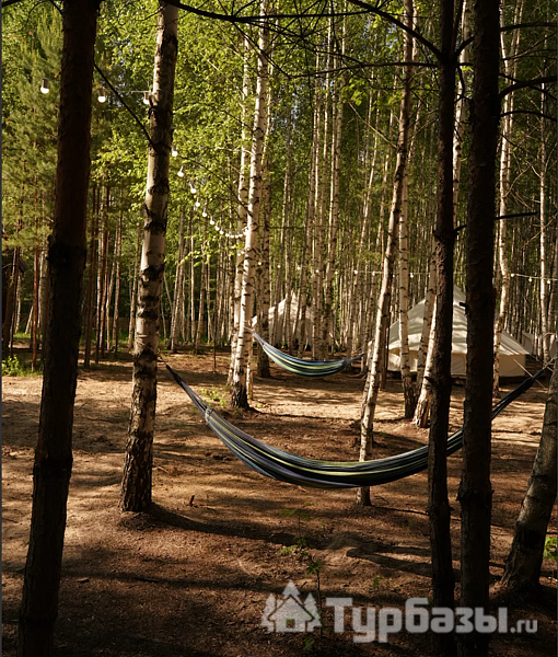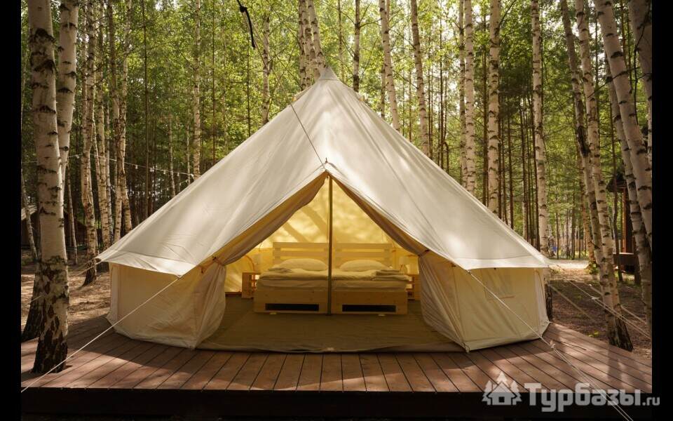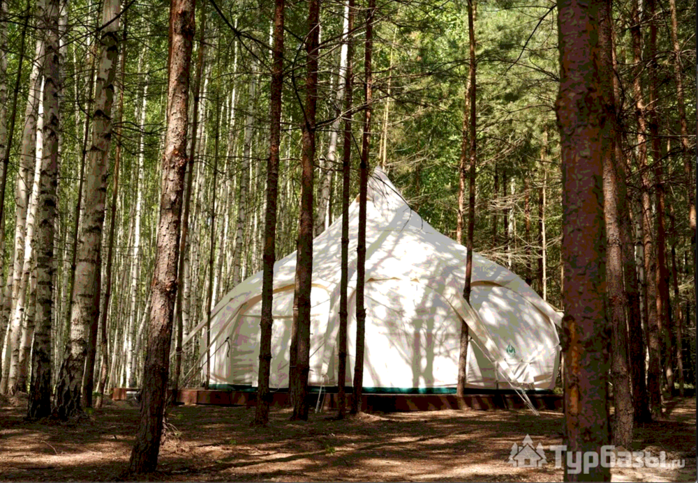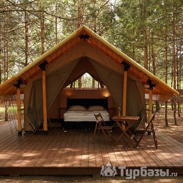 На территории есть 3 круглогодичных дома и 12 сезонных шатров (апрель–октябрь), а летом принимают и с собственными палатками. Для гостей организованы общая кухня с посудой, душевые и туалеты, детские и спортивные площадки, терраса, гриль-зоны и сцена для мероприятий.