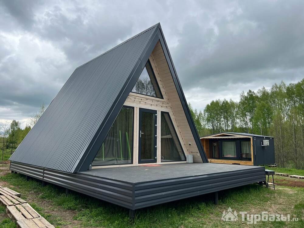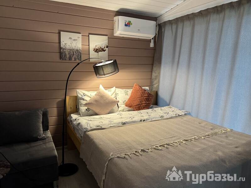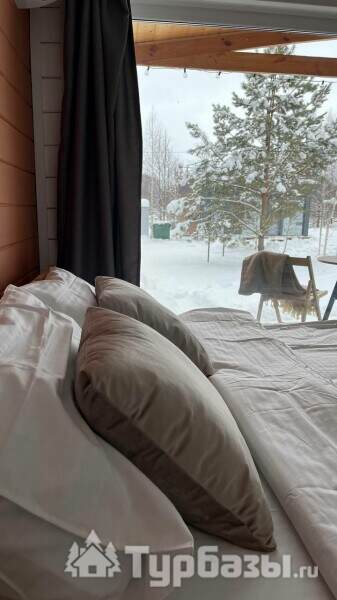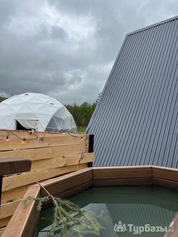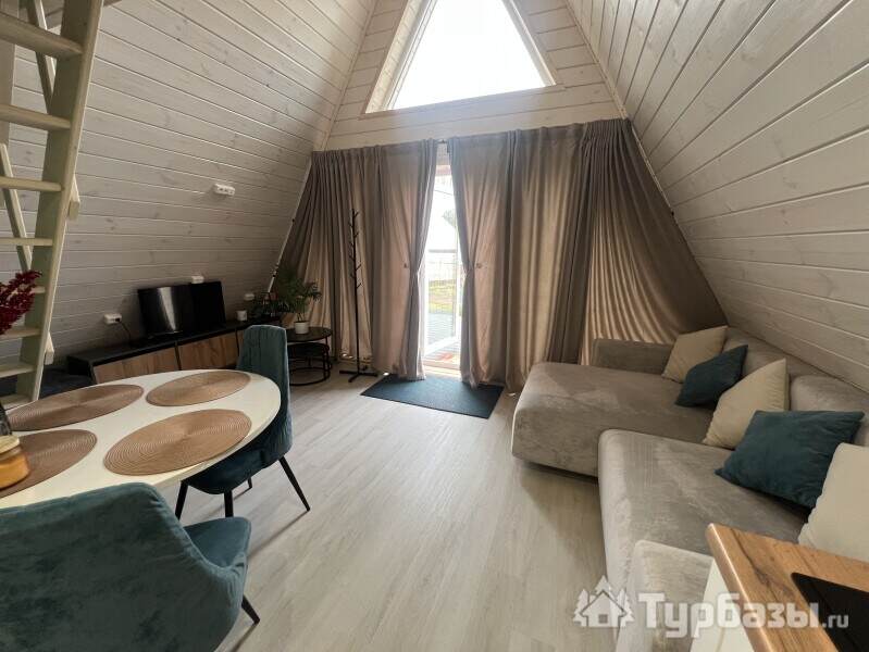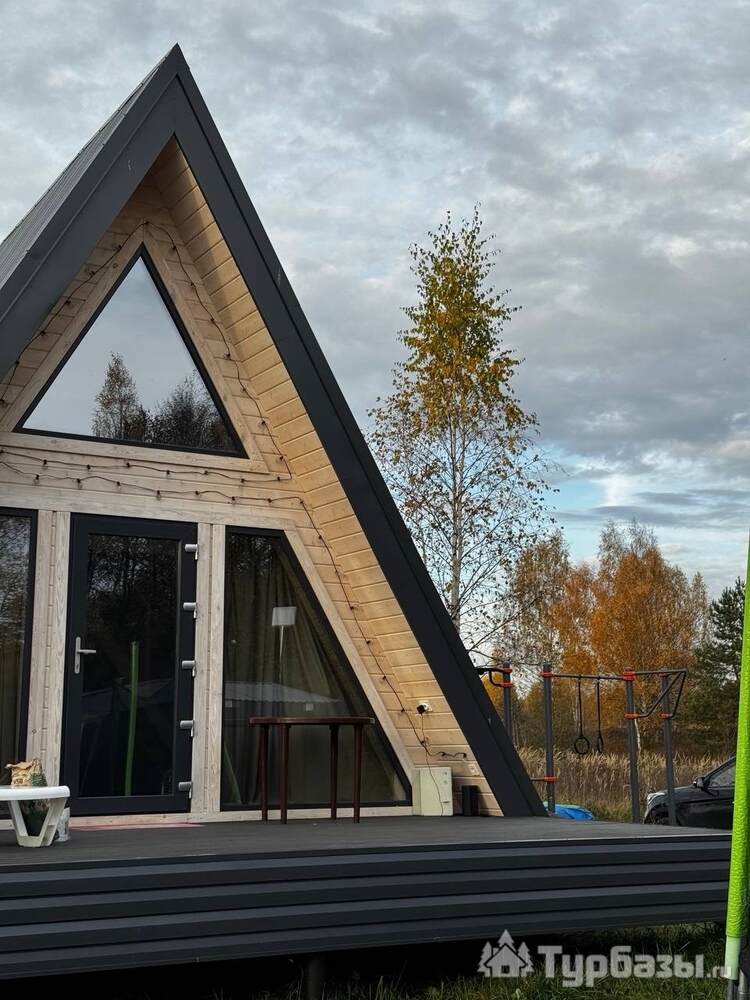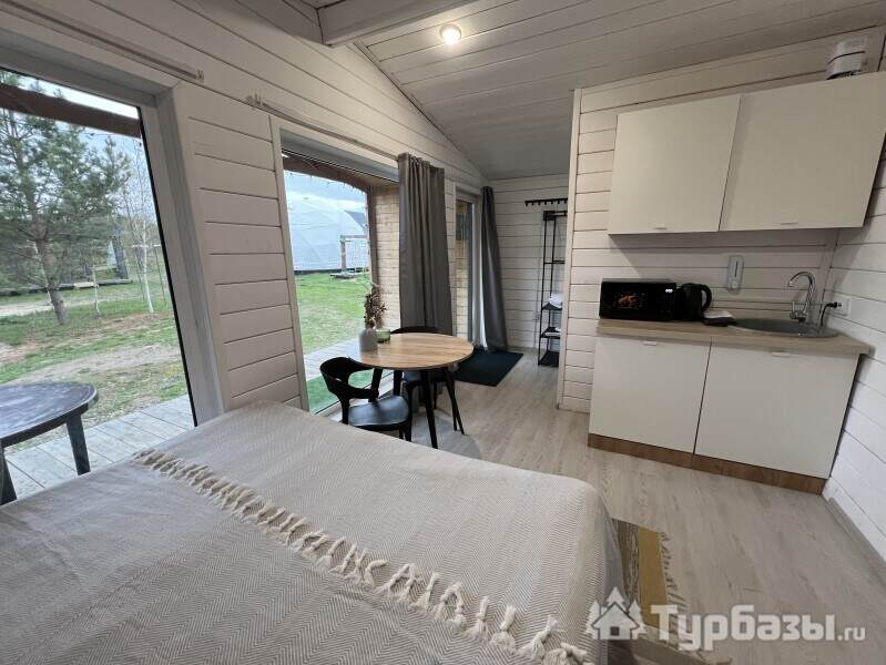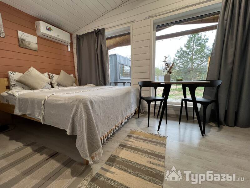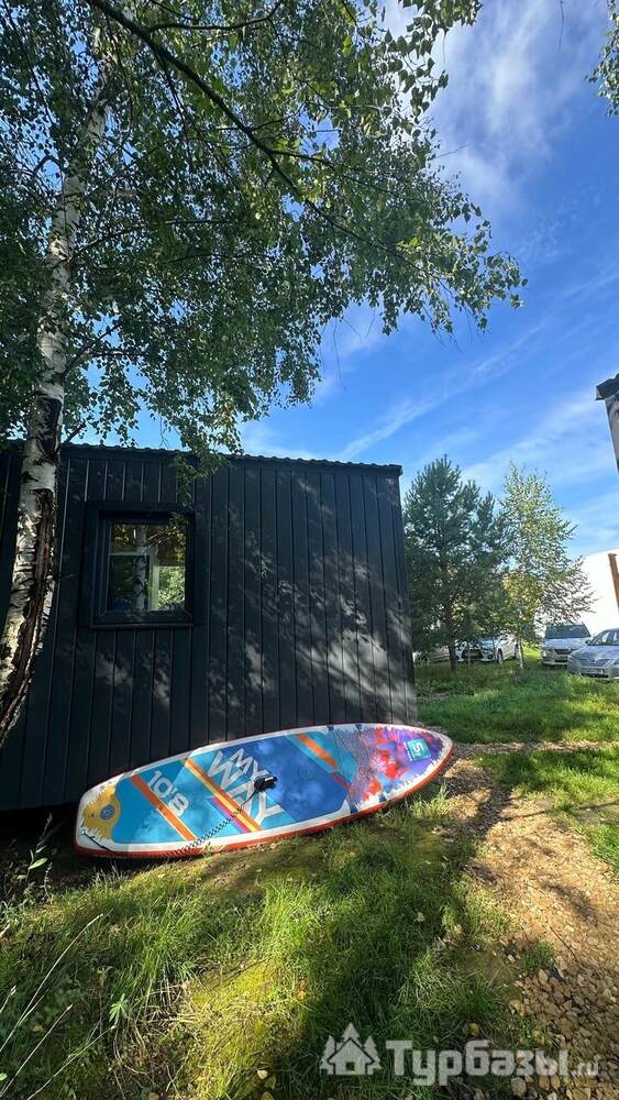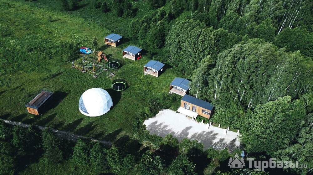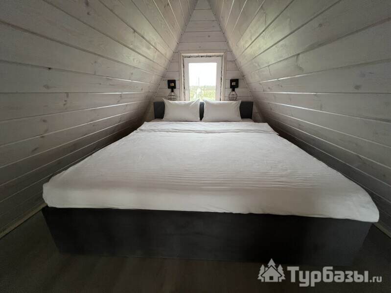 На территории несколько домиков разного формата (A-frame, барн-хаусы), есть баня и чаны, собственный пляж/спуск к воде, детская площадка, прокат надувных лодок, сап-бордов и катамаранов. В домиках обычно есть всё базовое для комфортного проживания (спальня, кухонный уголок, санузел); правилами запрещены вечеринки и размещение с животными.