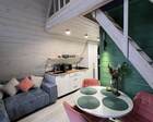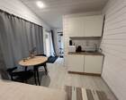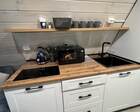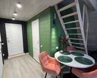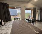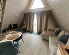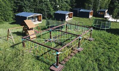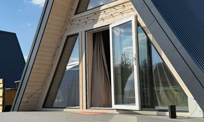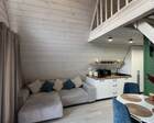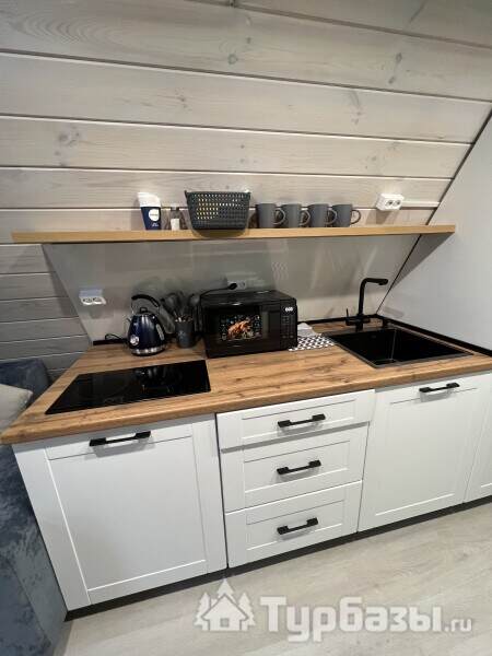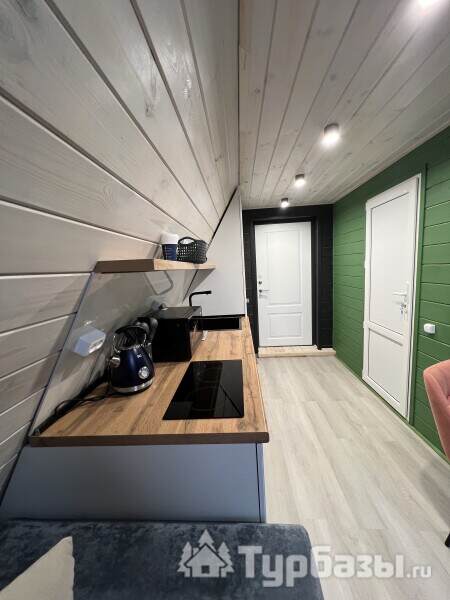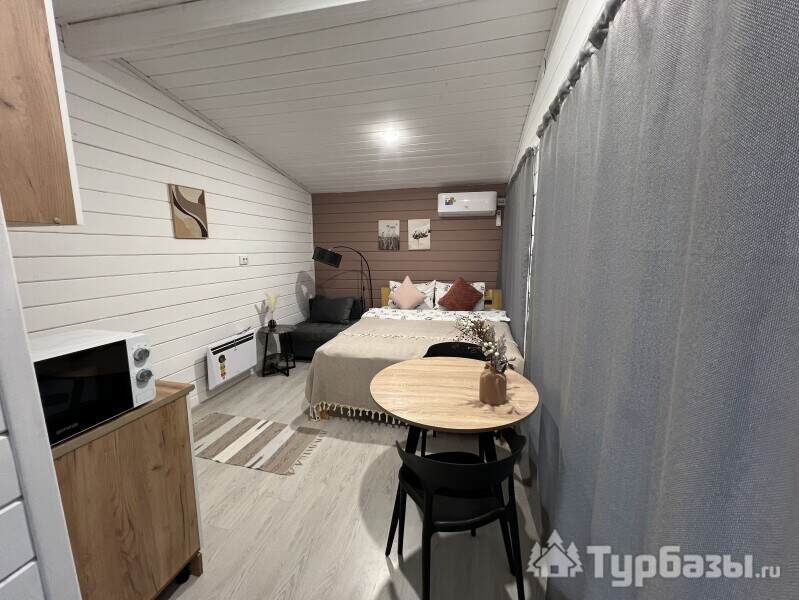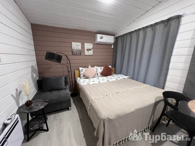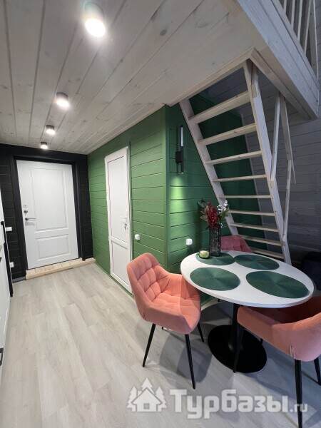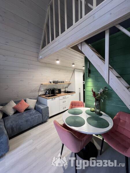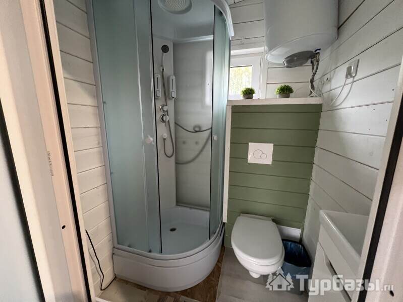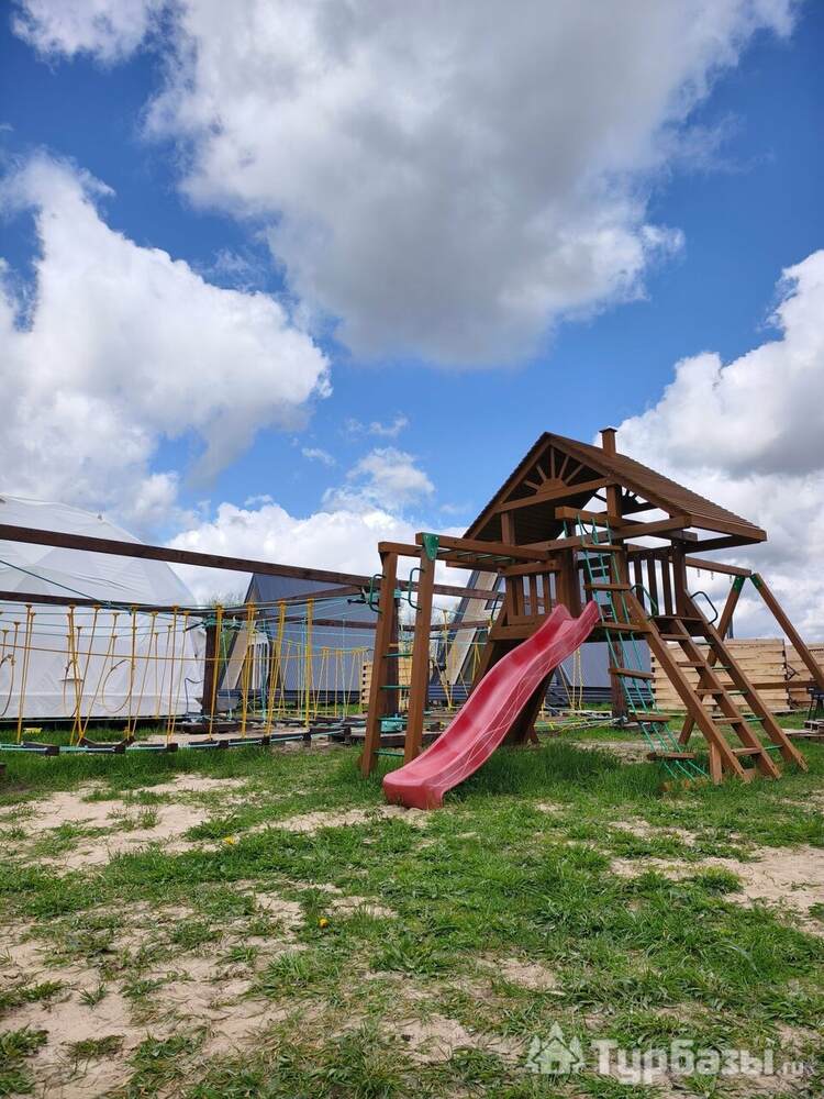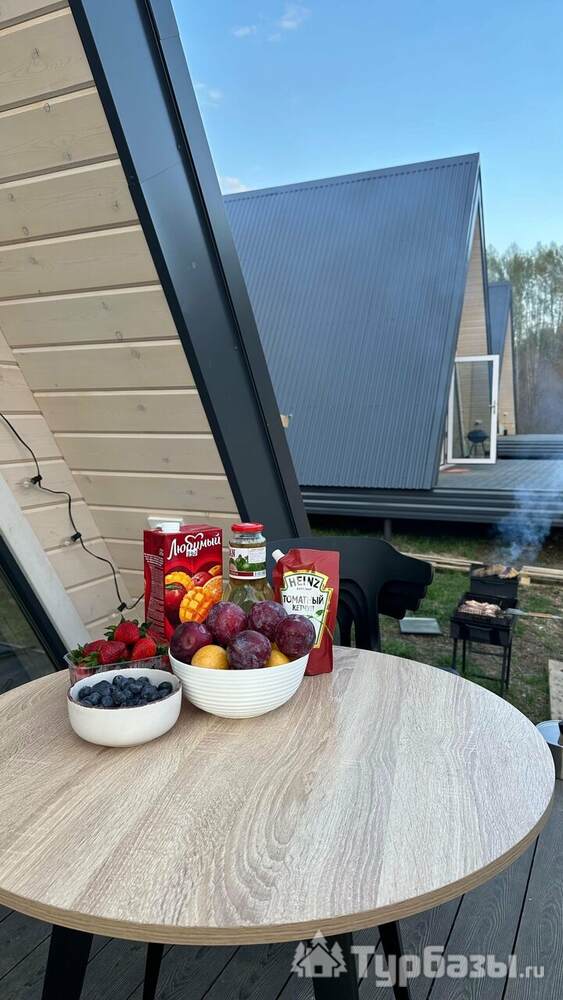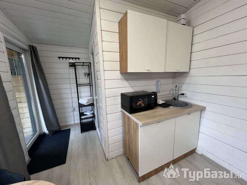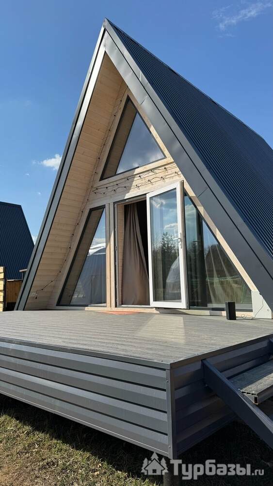 На территории несколько домиков разного формата (A-frame, барн-хаусы), есть баня и чаны, собственный пляж/спуск к воде, детская площадка, прокат надувных лодок, сап-бордов и катамаранов. В домиках обычно есть всё базовое для комфортного проживания (спальня, кухонный уголок, санузел); правилами запрещены вечеринки и размещение с животными.
