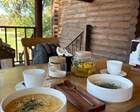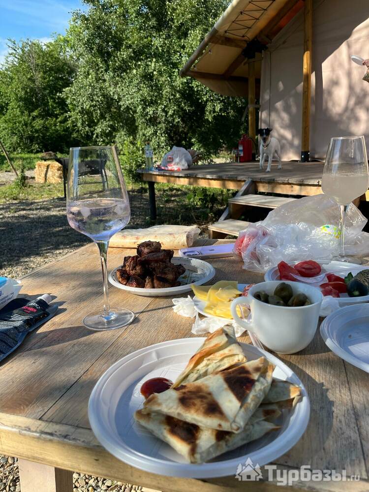 Питание организовано в гибком формате: на территории работает ресторан/кухня, рассчитанная на гостей глэмпинга, а также имеются оборудованные площадки для пикников и мангалов — это позволяет сочетать формальный ресторанный сервис и самостоятельное приготовление.