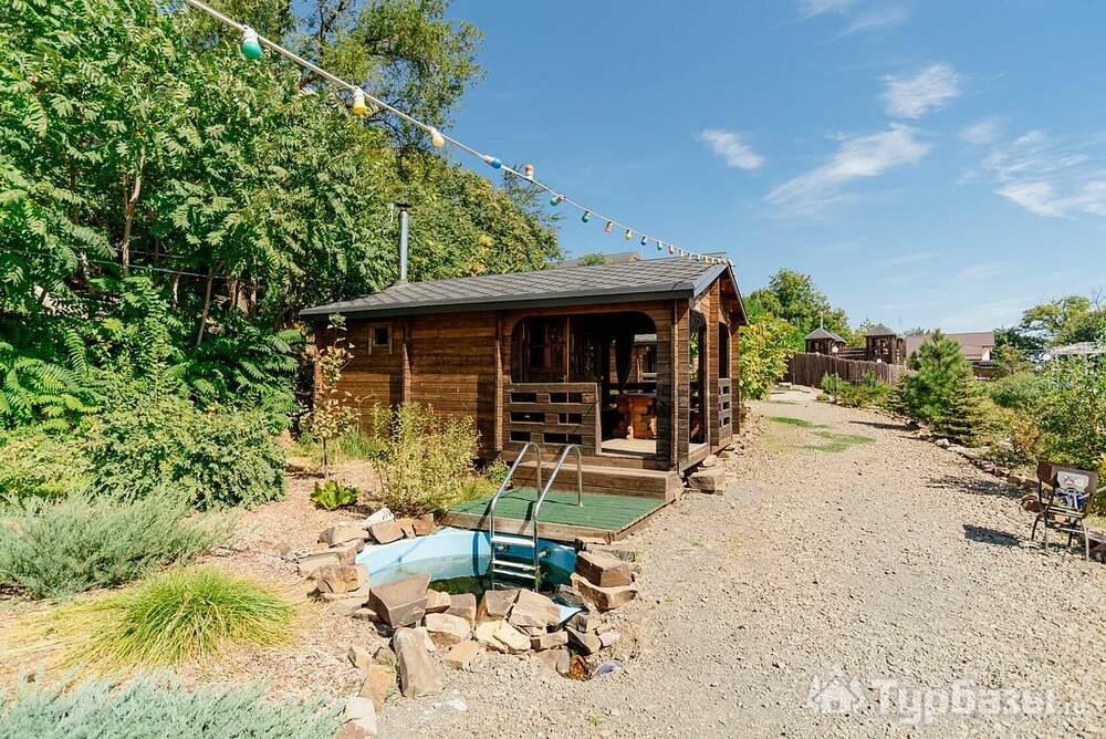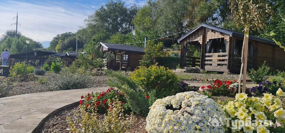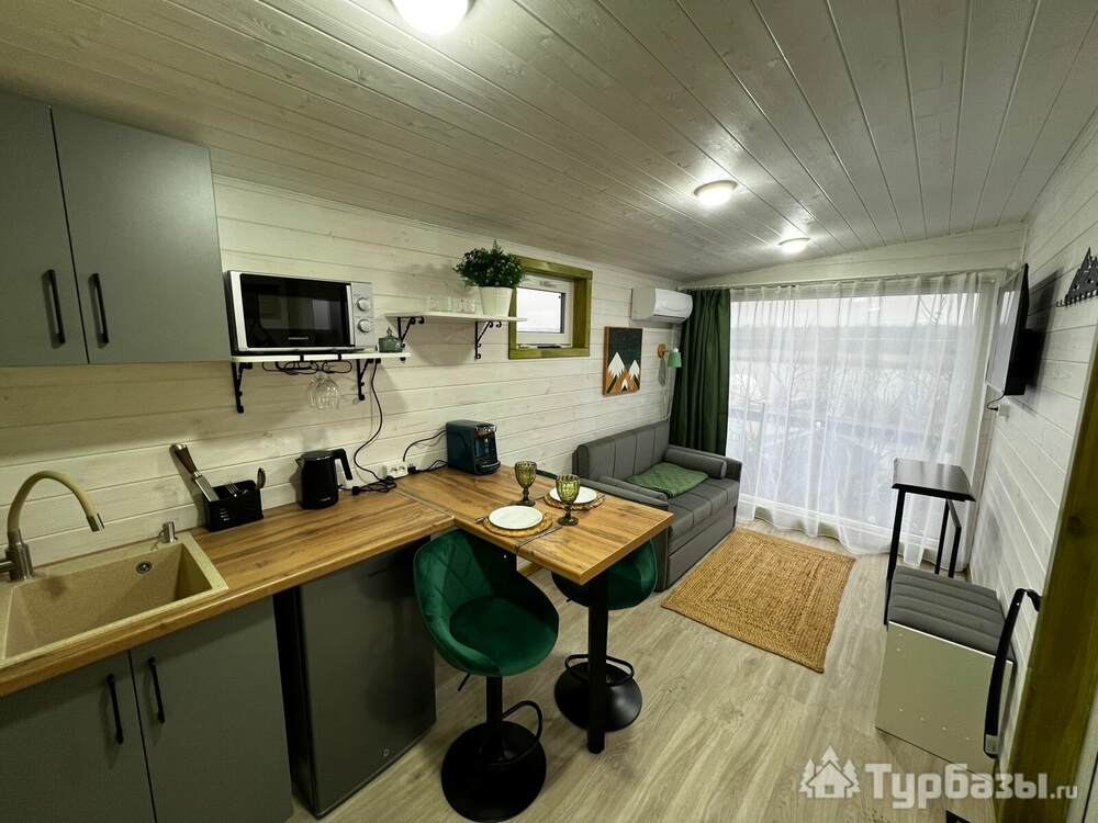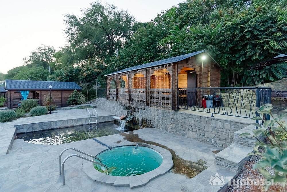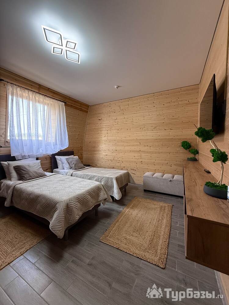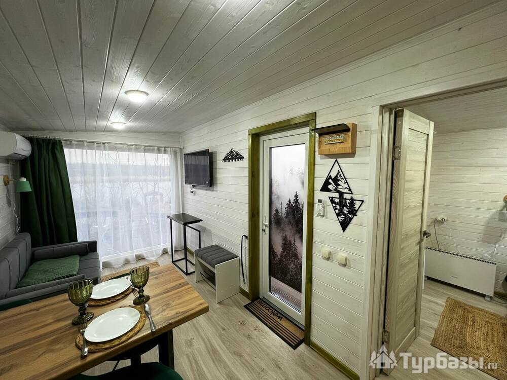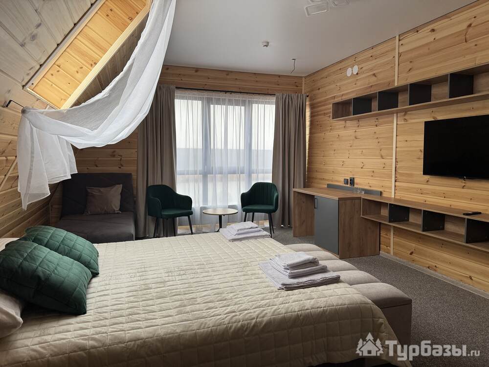 Парк-отель объединяет гостиничный корпус и тематические домики, оформленные в «горном» стиле — в карточках номеров встречаются названия вроде «Эльбрус», «Архыз», «Домбай», «Теберда» и др. Каждый домик оснащён отдельной спальней и санузлом; стандартный комплект удобств включает холодильник, микроволновку, smart-TV и посуду. В ряде домиков установлены банные чаны под открытым небом — приватная купель с подогревом, которую можно арендовать совместно с проживанием в соответствующем домике.