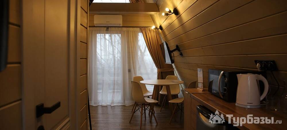 - A-Frame домики — двухэтажные домики с мини-кухней, террасой и видом на зелёные зоны/море; их формат рассчитан на 2–4 гостей и удобен для семейных мини-ретритов.