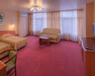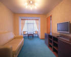 Площадь - 30 кв.м. В номере: телевизор, Wi-Fi, холодильник, кондиционер, ванна или душевая кабина, санузел, биде, двуспальная кровать, две полутороспальные кровати, диван, кресла, тумбы, шкаф, журнальный столик, мебельный гарнитур.