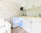Кухня оборудована всем необходимым для готовки (индукционная плита, мини- холодильник, микроволновка, сковорода, кастрюля, ковшик, тарелки, чашки, бокалы, приборы). Теплые полы в кухне и спальне.