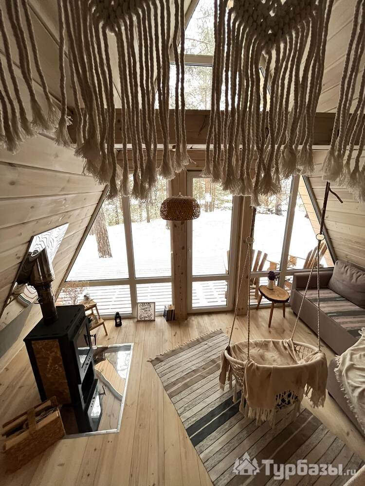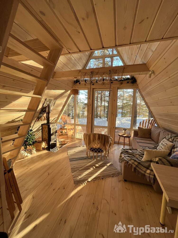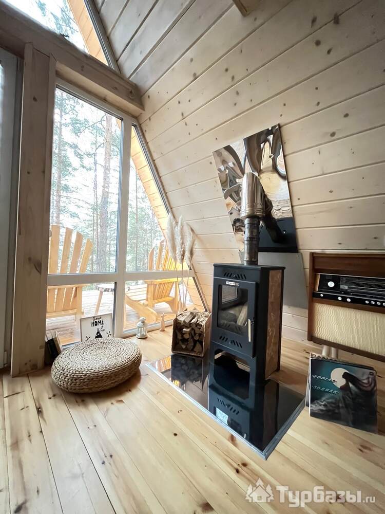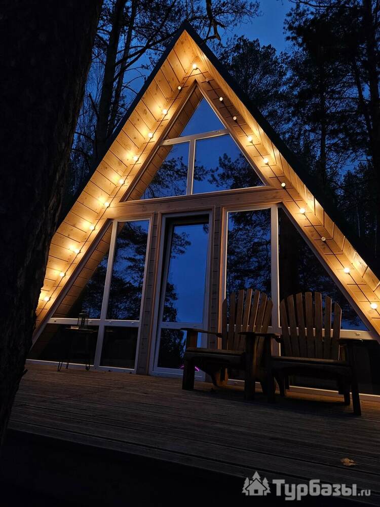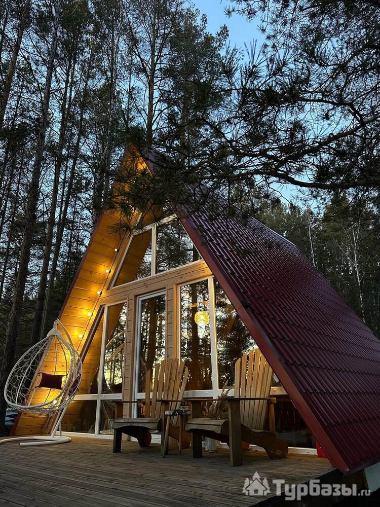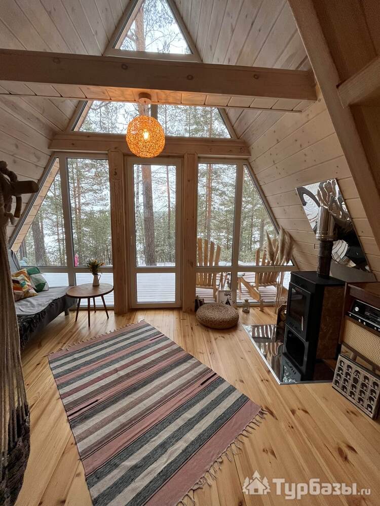На территории — тёплые деревянные домики A-frame/барн-формата с верандами, общие и частные мангальные площадки, банный модуль и причал для купания и лодок. В домиках обычно есть базовый набор удобств (постель, отопление, мини-кухня в зависимости от типа).