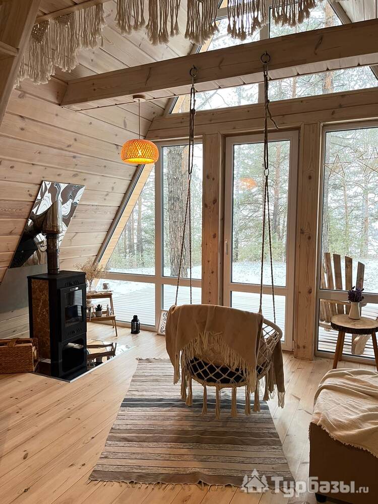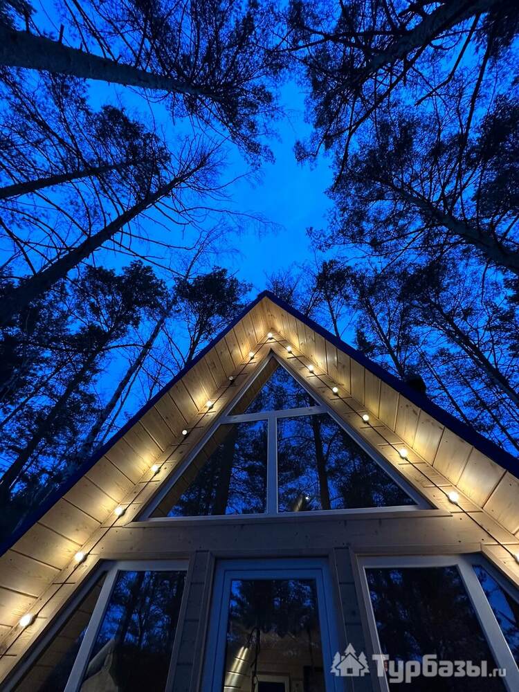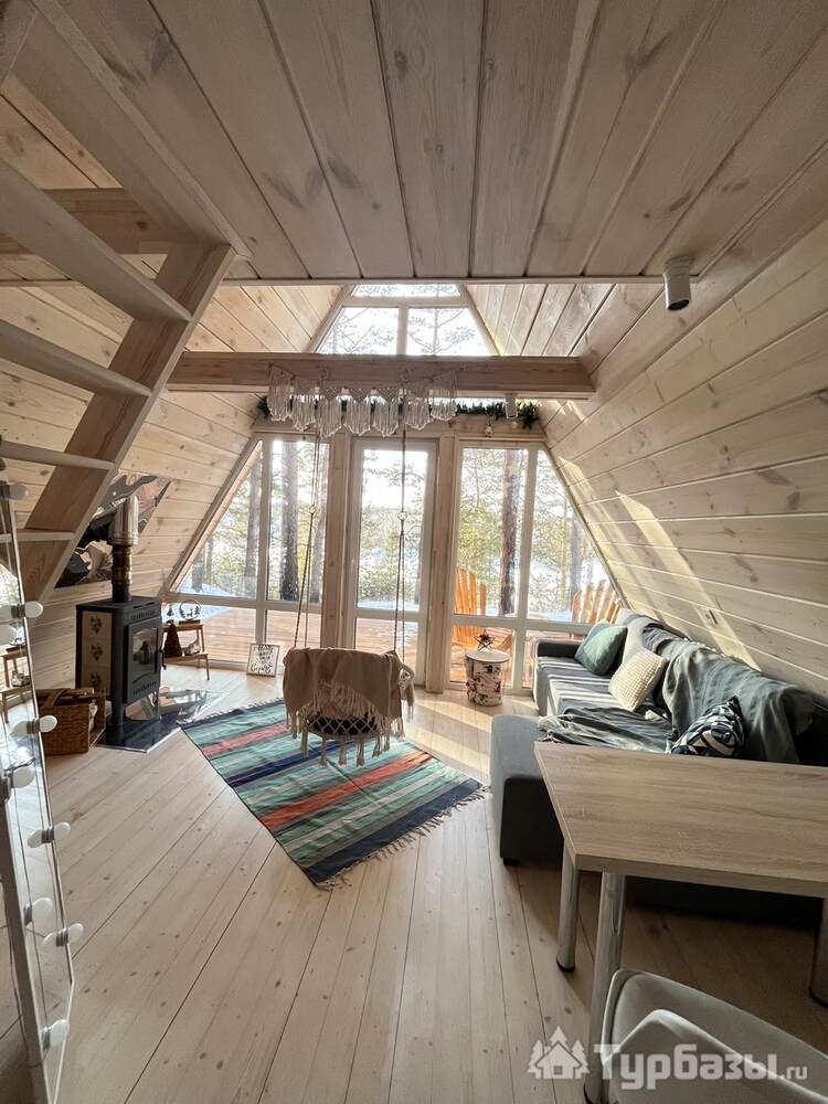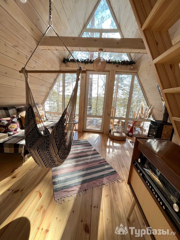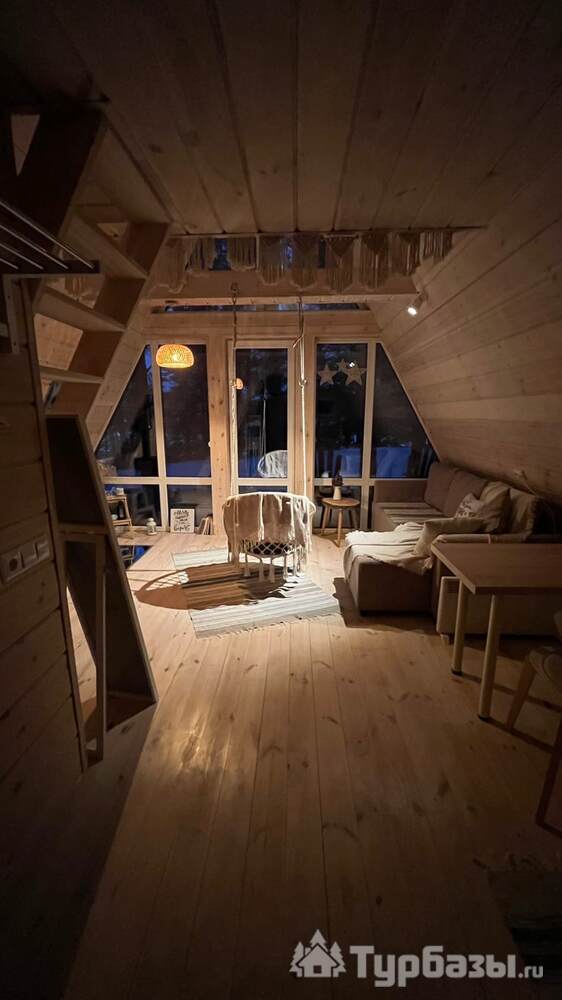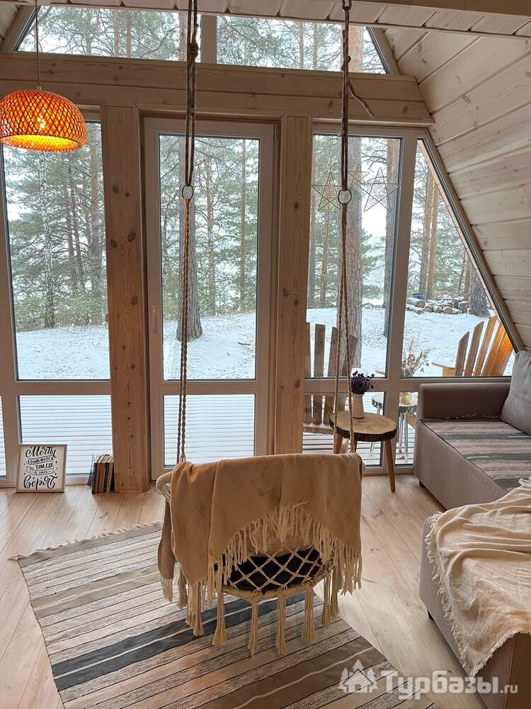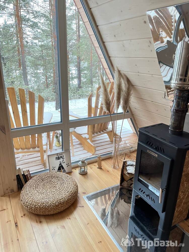 На территории — тёплые деревянные домики A-frame/барн-формата с верандами, общие и частные мангальные площадки, банный модуль и причал для купания и лодок. В домиках обычно есть базовый набор удобств (постель, отопление, мини-кухня в зависимости от типа).