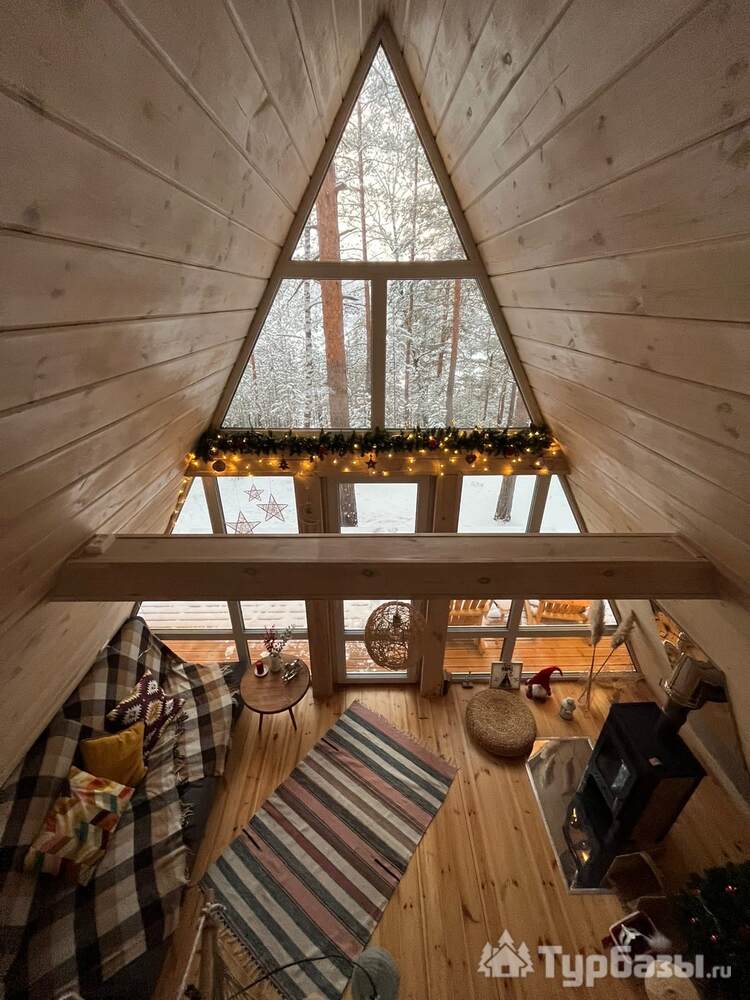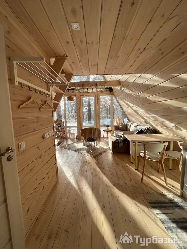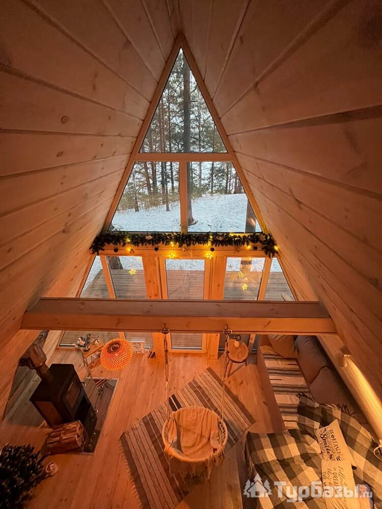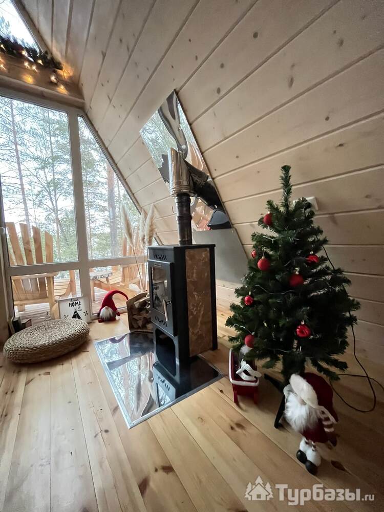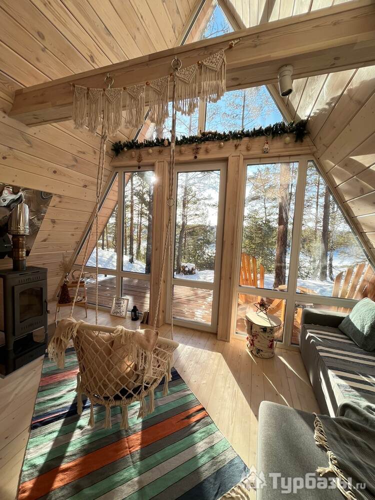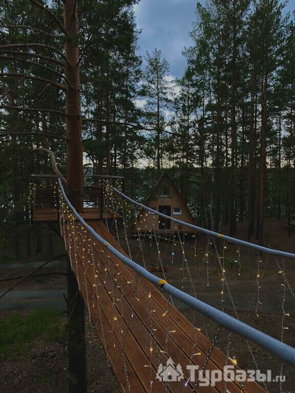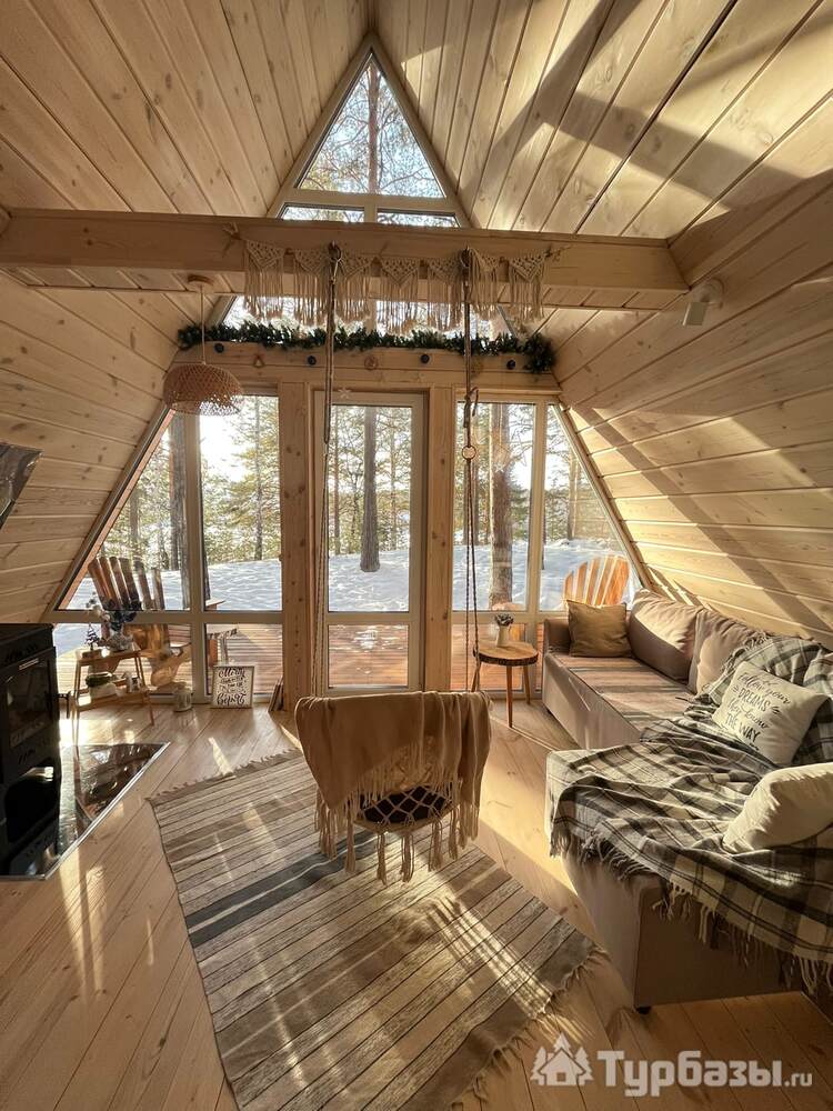 На территории — тёплые деревянные домики A-frame/барн-формата с верандами, общие и частные мангальные площадки, банный модуль и причал для купания и лодок. В домиках обычно есть базовый набор удобств (постель, отопление, мини-кухня в зависимости от типа).