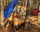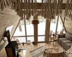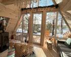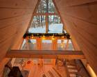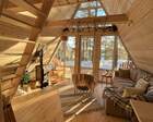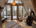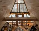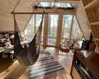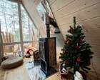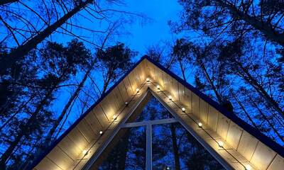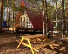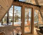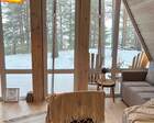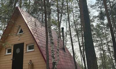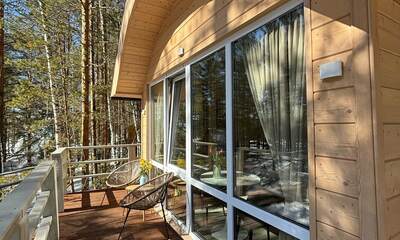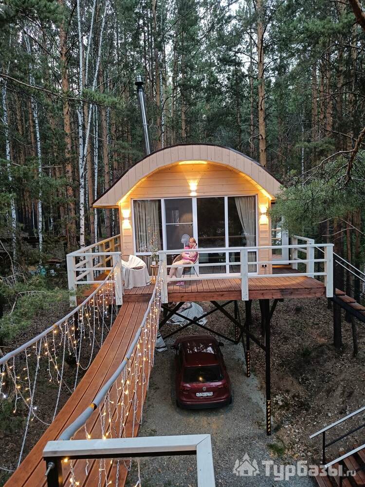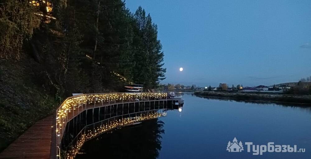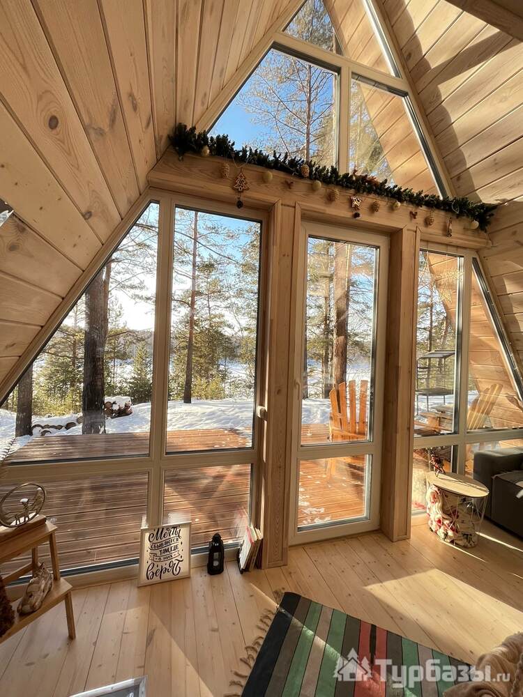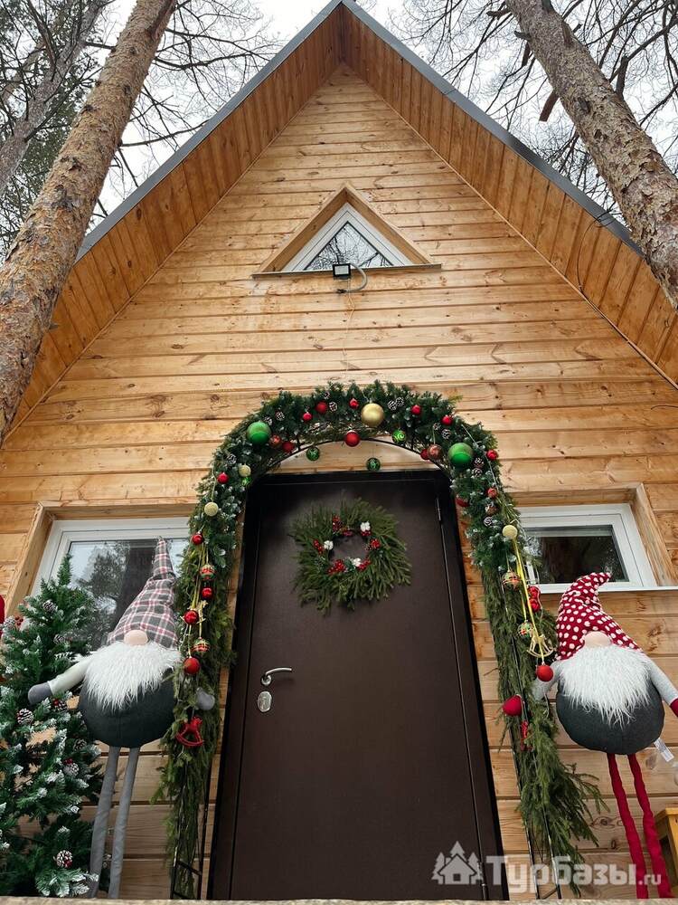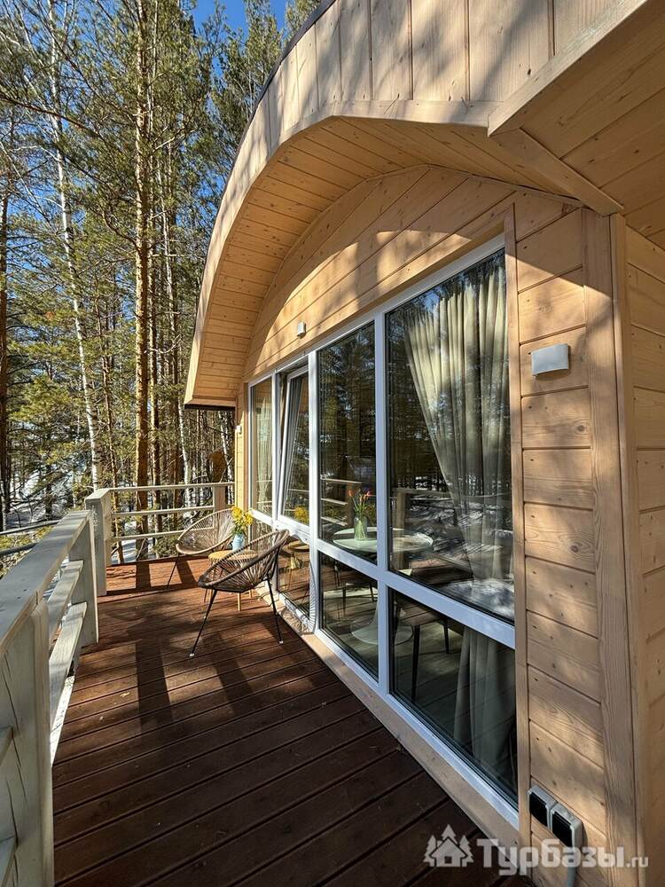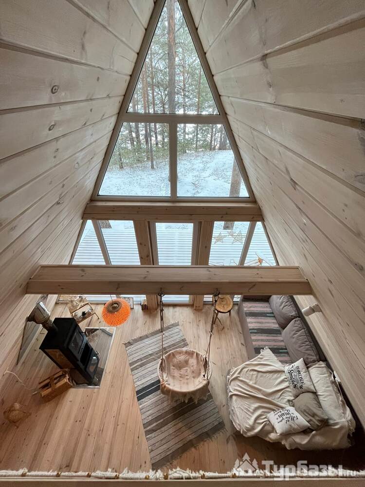 На территории — тёплые деревянные домики A-frame/барн-формата с верандами, общие и частные мангальные площадки, банный модуль и причал для купания и лодок. В домиках обычно есть базовый набор удобств (постель, отопление, мини-кухня в зависимости от типа).