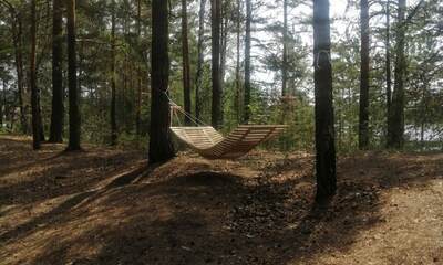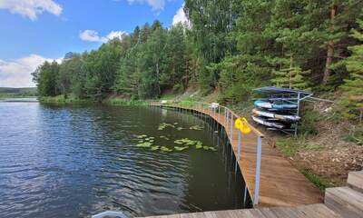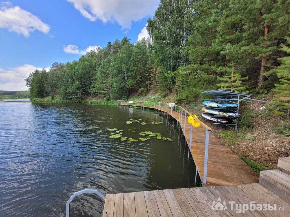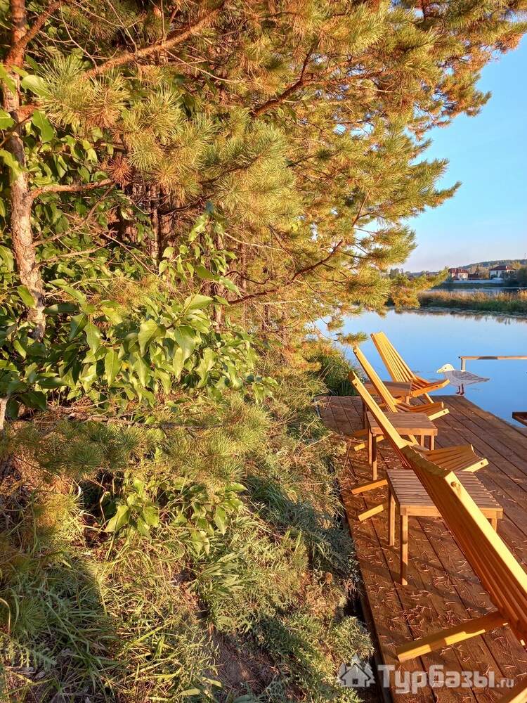 Днём гости гуляют по лесу и берегу, катаются на SUP/лодках или рыбачат; вечером — банные сессии, чан и посиделки у костра.