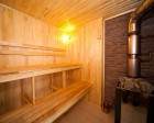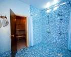 Есть сауна с бассейном, площадь которого 20 кв. м. Его украшением является водопад. Бассейн с подсветкой, подогревом и противотоковой системой. В помещении установлен каменный лежак больших размеров. Он имеет анатомическую форму и подогревается.