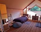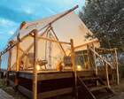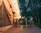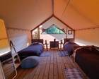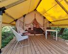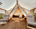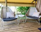 — Просторная веранда перед палаткой с комфортными шезлонгами и столиком