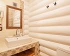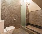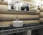 Ванная комната полностью выполнена из дизайнерской плитки, а одна из стен -натуральное дерево. В комнате есть столешница с раковиной, унитаз, душевая, полотенцесушитель, зеркало с подсветкой, фен.