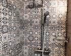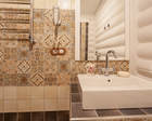 Ванная комната полностью выполнена из дизайнерской плитки, а одна из стен - натуральное дерево. В комнате есть столешница с раковиной, унитаз, душевая, полотенцесушитель, зеркало с подсветкой, фен.