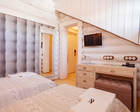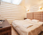 В каждом номере располагаются две большие односпальные кровати, которые при желании можно сдвинуть и будет полноценная большая двуспальная кровать, а изголовьем для них служит большая мягкая стена. В комнате есть две прикроватные тумбочки, шкаф для одежды и обуви, пуфик, большое зеркало в раме, столик, в котором находится небольшой буфетный шкафчик, телевизор и внутренний телефон.