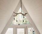 Домик возведен в треугольной форме, что придает ему оригинальный дизайн. Внутри все продумано до мельчайших деталей. В помещении присутствуют светлые тона. Можно лежать на диване или сидеть за столиков, чтобы просто любоваться местным пейзажем через окно. Если нет желания сидеть в помещении, то можно выйти на веранду, где горят огоньки. Это создает некий сказочный образ, когда отдыхающий смотрит на лес и стоит в разноцветных огнях. Это настоящая действительность.