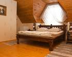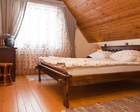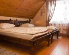 Это новый деревянный двухэтажный коттедж. Комнаты для отдыха находятся на втором этаже. Сюда ведет отдельный вход. Планировка включает три двухместных номера, внизу кухня – гостиная. В ней можно самостоятельно приготовить еду. Или пожарить шашлык на свежем воздухе.
