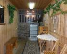 Одноэтажный коттедж, стилизованный под корабль, с мезонином, просторный холл с камином и балконами. В холле большой стол со скамейками на 20 персон, 5 комнат по 4 кровати. Кухня посудой не укомплектована. Душевая кабина, санузел. Наличие постельного белья. Возле дома столы со скамейками, парковка.
