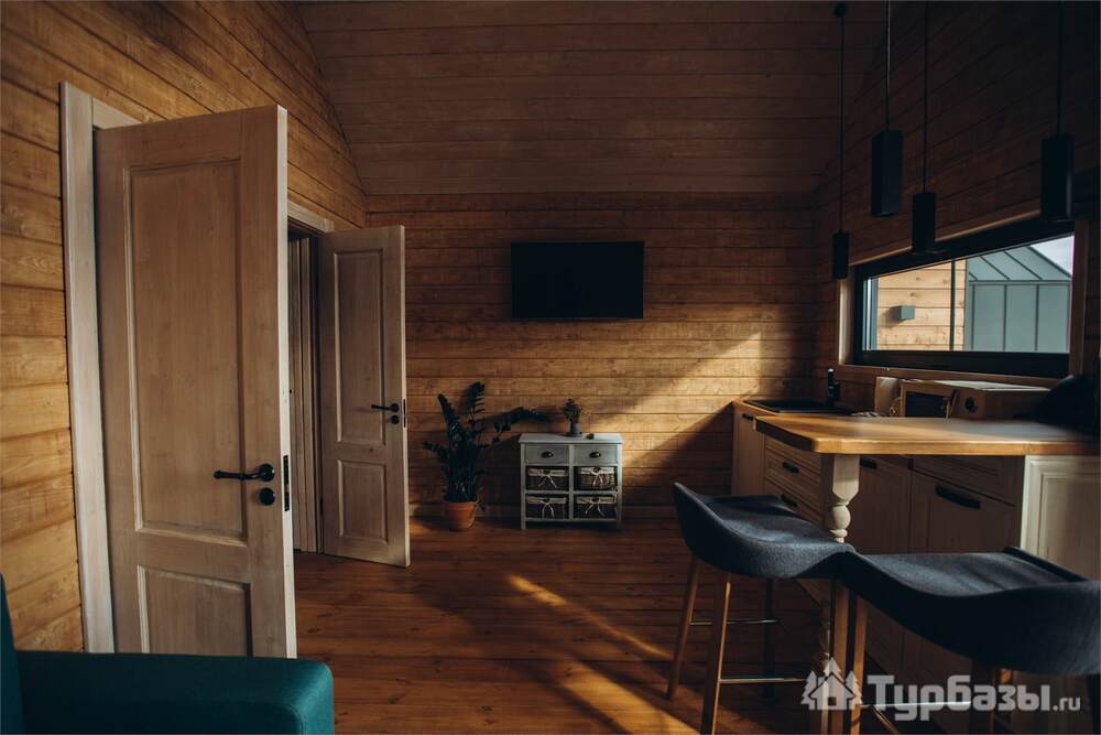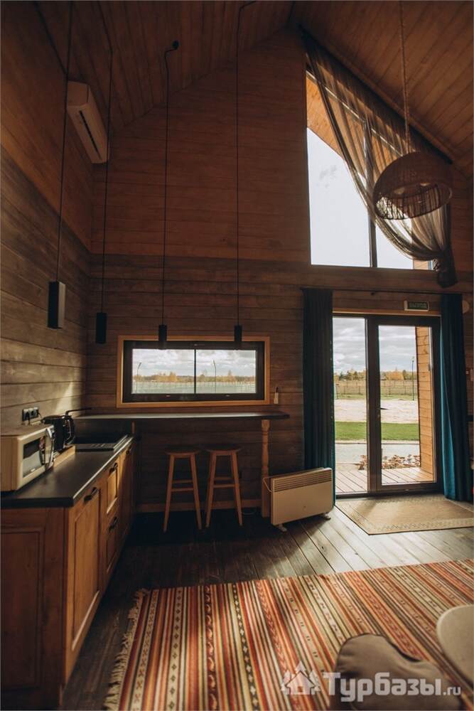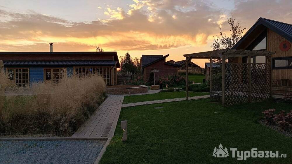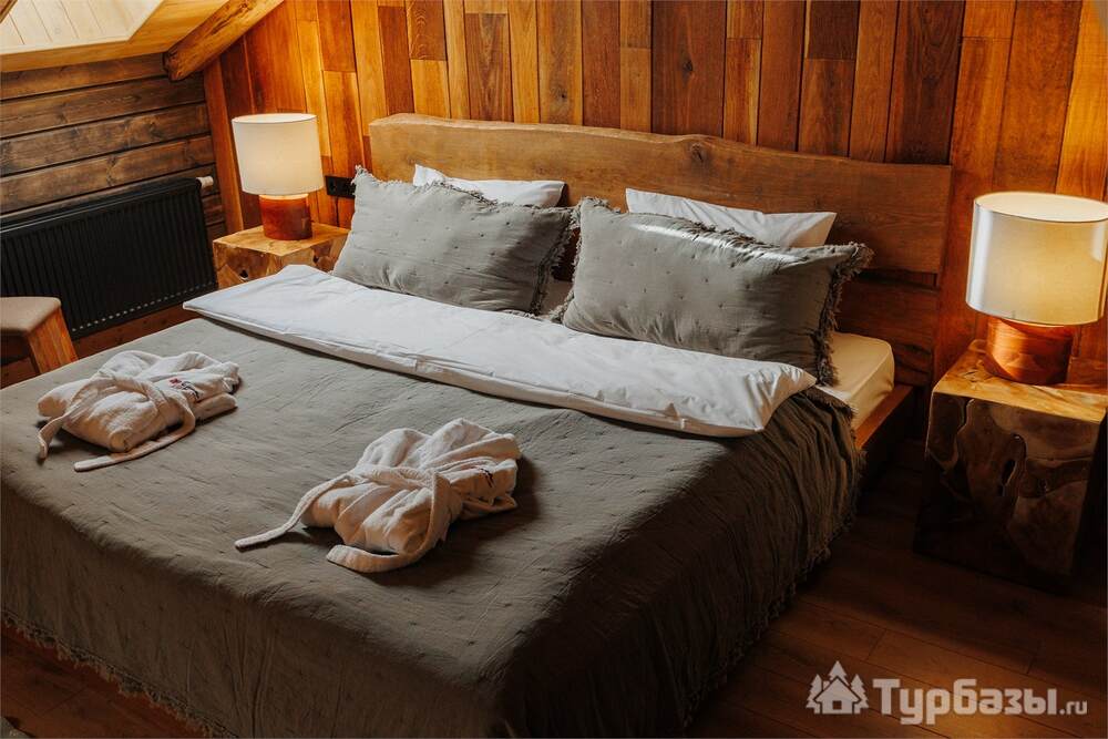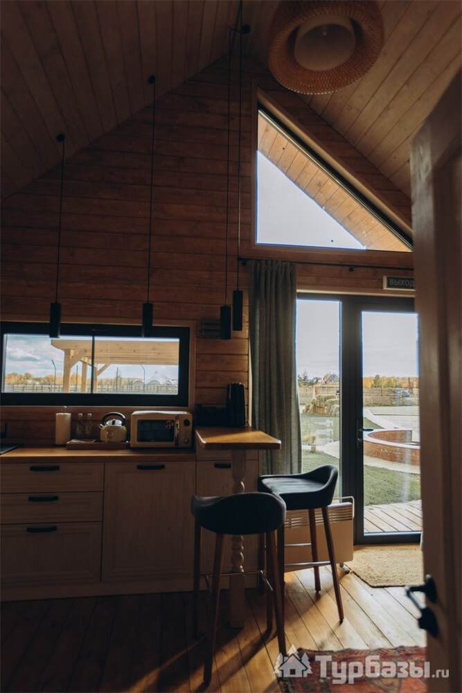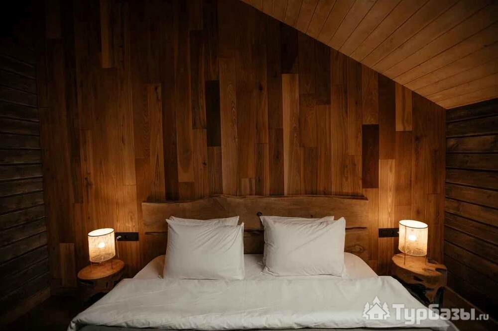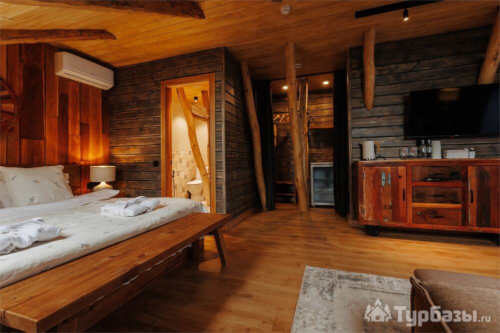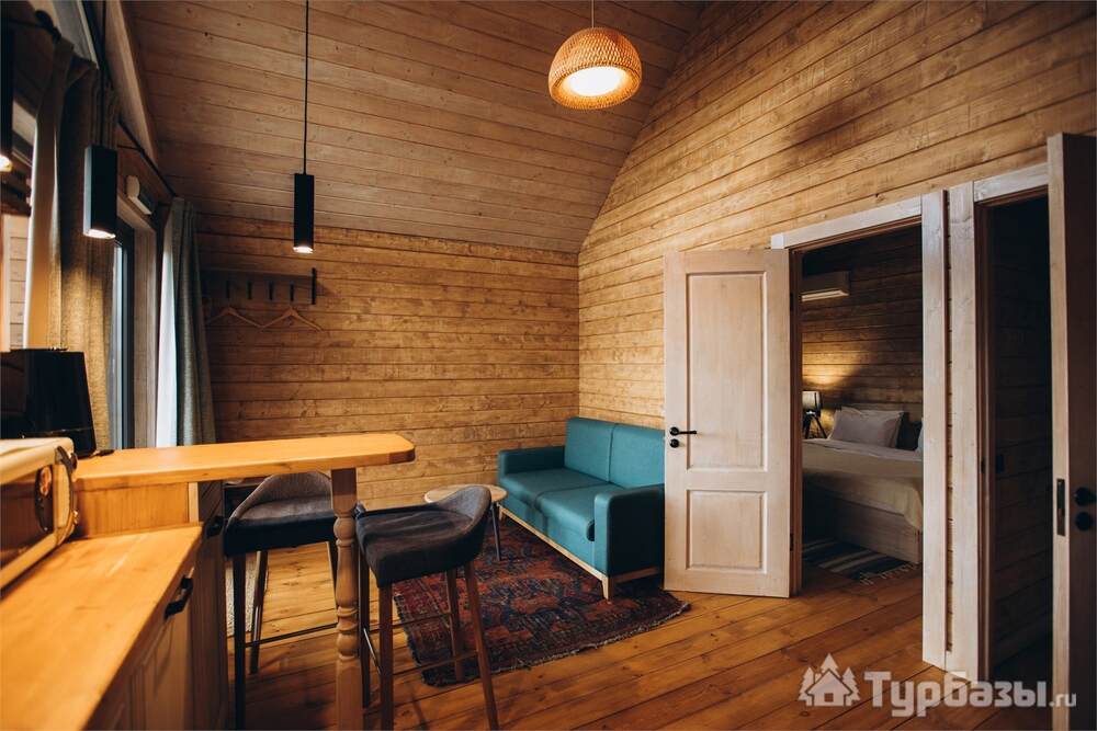 Архитектура комплекса выдержана в тёплой стилистике: домики, шале и барнхаузы аккуратно вписаны в ландшафт, а мебель из массива дерева и лоскутные одеяла усиливают впечатление «рукотворного уюта». Интерьеры не пытаются быть эклектичными — напротив, они дают пространство для природного фона: большие окна, террасы и веранды ориентированы на зелёные перспективы, так что основная «декорация» всегда остаётся на улице. Такое решение делает отдых менее «туристическим» и более интимным — как будто вы гостите в благоустроенной деревенской усадьбе.