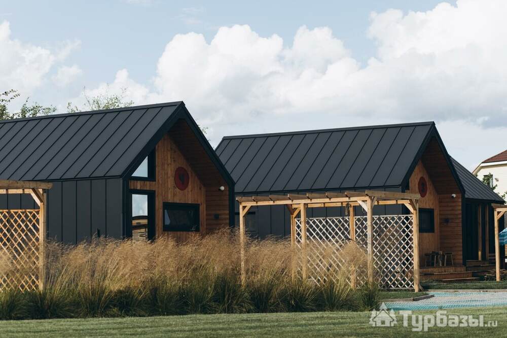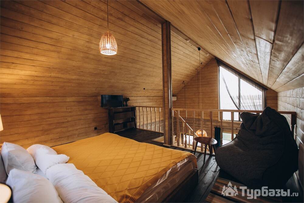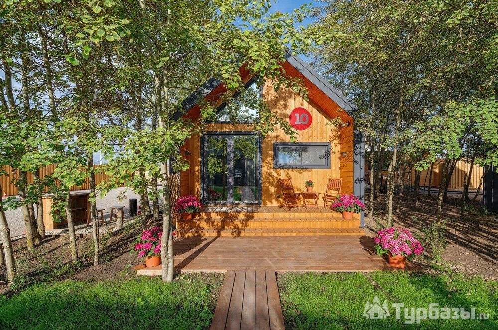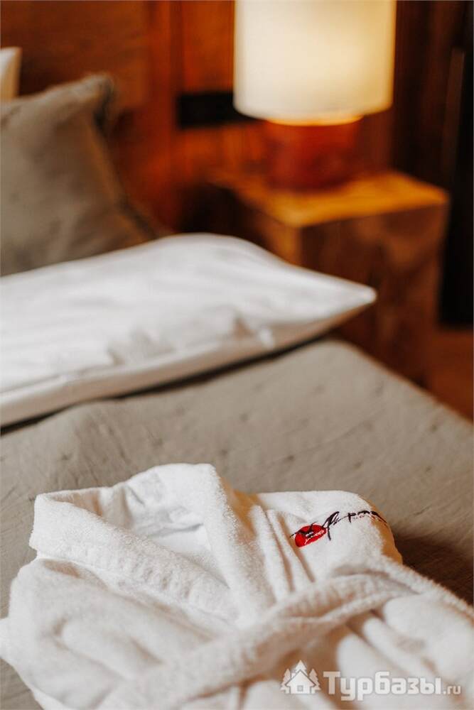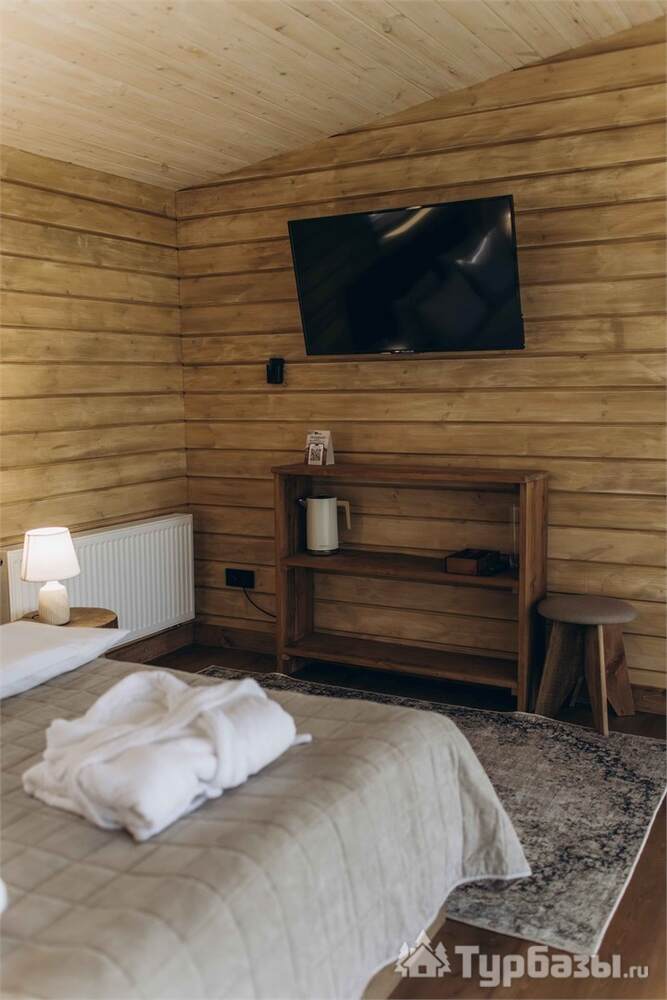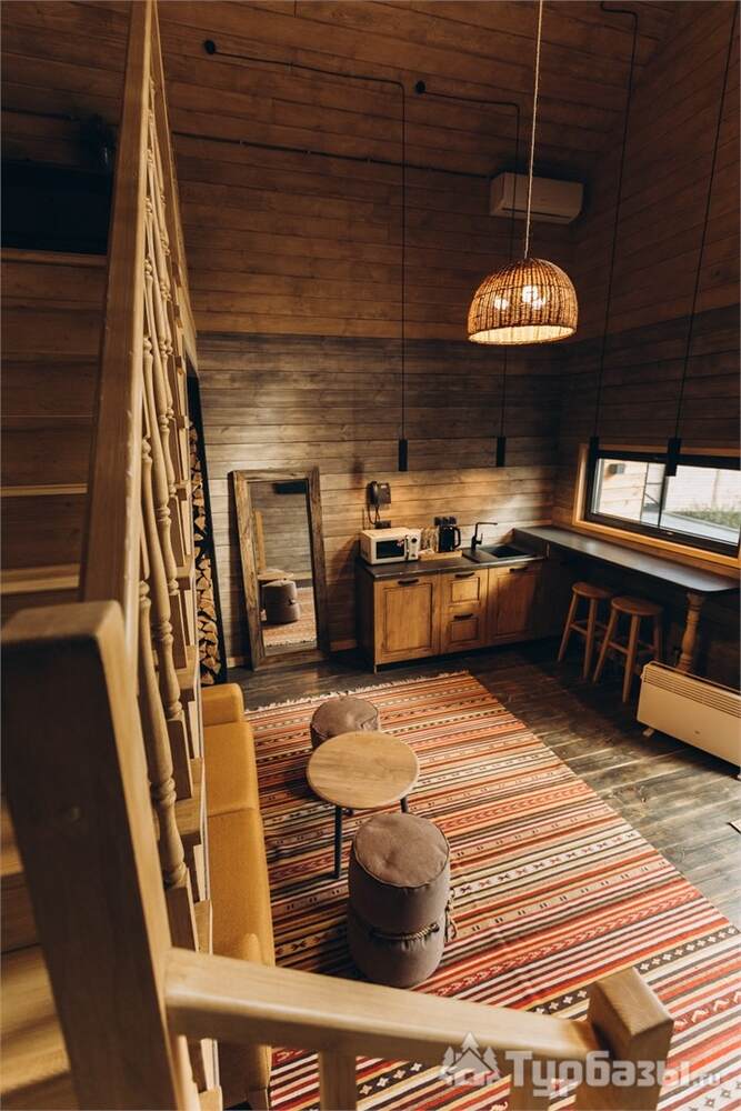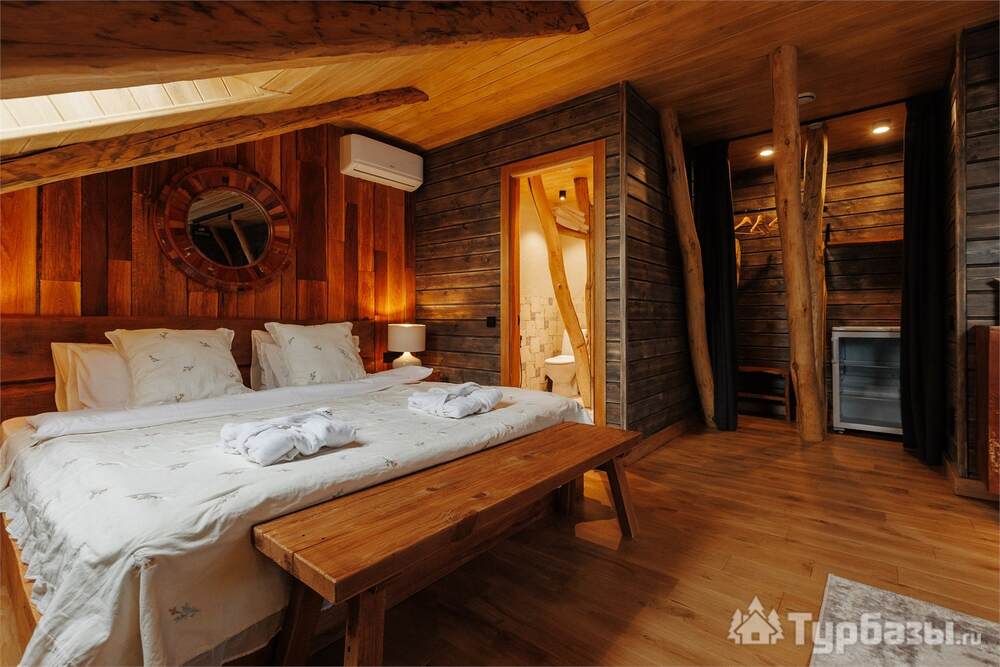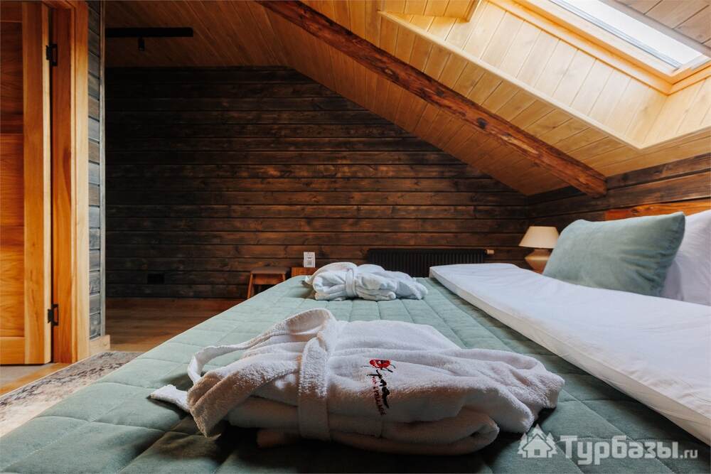 Архитектура комплекса выдержана в тёплой стилистике: домики, шале и барнхаузы аккуратно вписаны в ландшафт, а мебель из массива дерева и лоскутные одеяла усиливают впечатление «рукотворного уюта». Интерьеры не пытаются быть эклектичными — напротив, они дают пространство для природного фона: большие окна, террасы и веранды ориентированы на зелёные перспективы, так что основная «декорация» всегда остаётся на улице. Такое решение делает отдых менее «туристическим» и более интимным — как будто вы гостите в благоустроенной деревенской усадьбе.