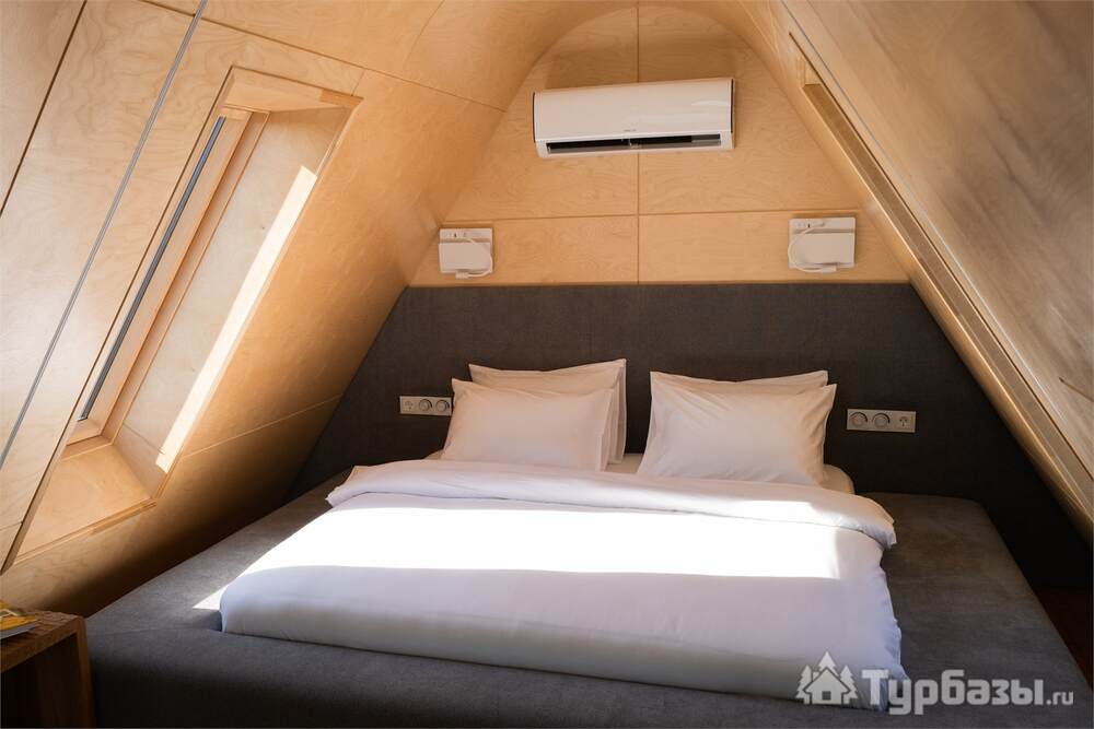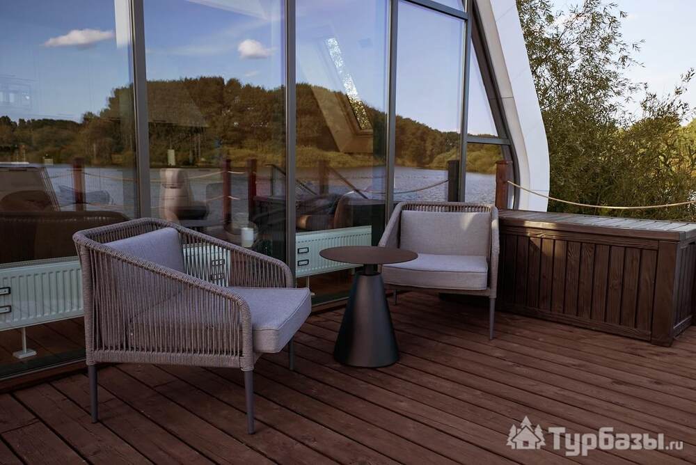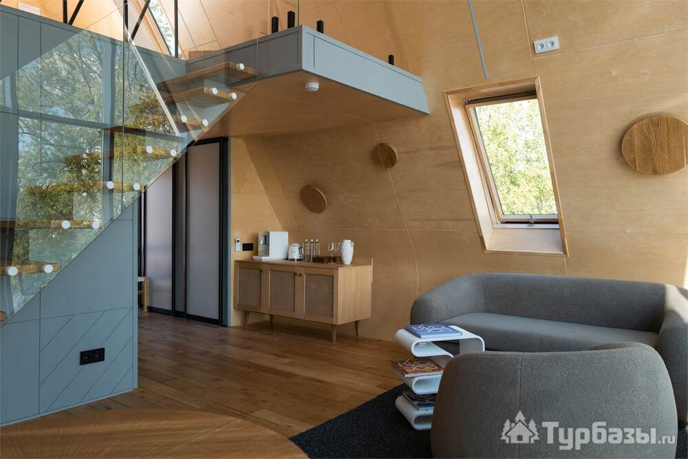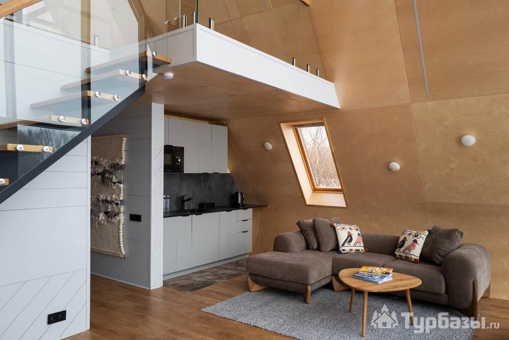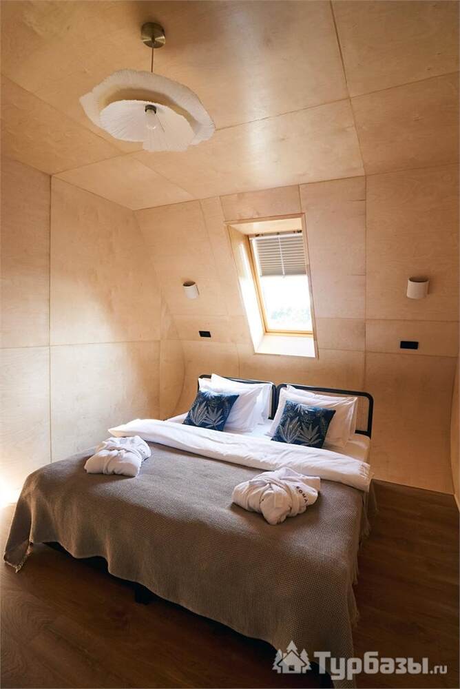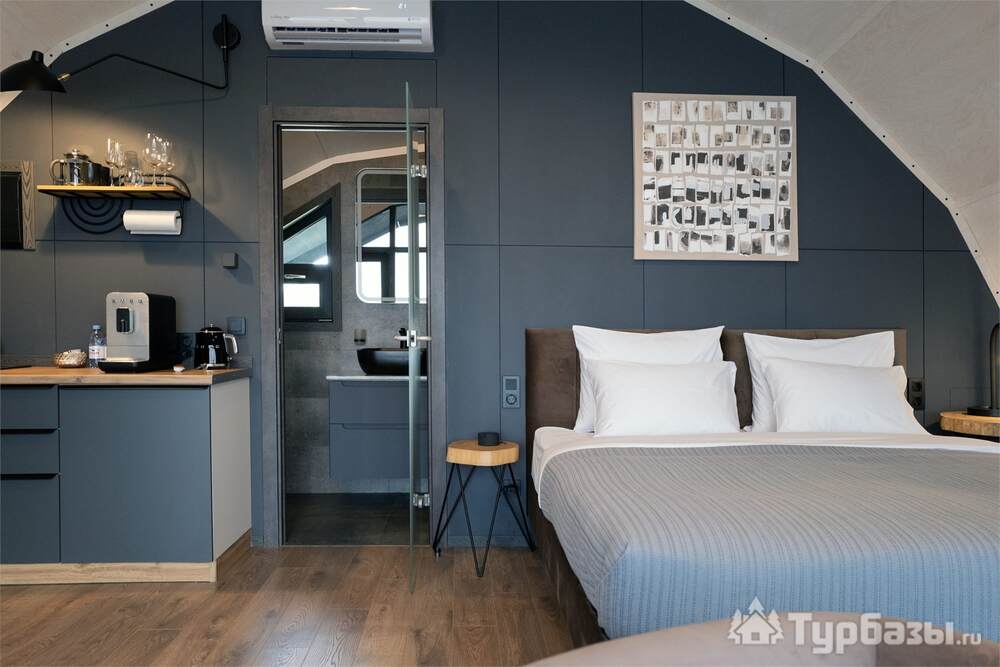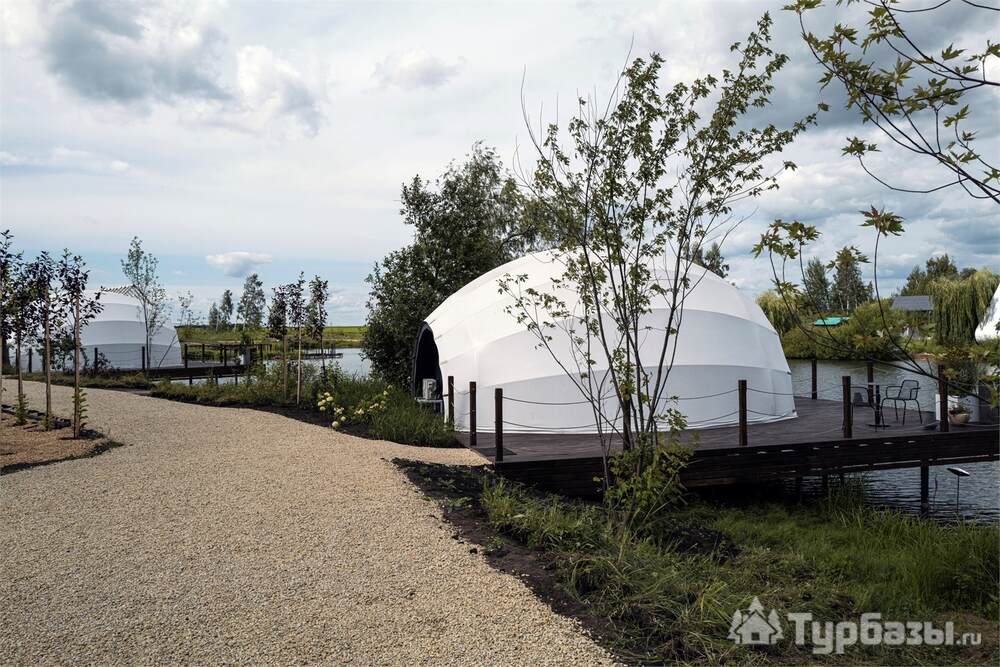 Комплекс представляет собой набор индивидуальных домов разной вместимости и планировки, каждый из которых обладает панорамными окнами и террасами с видом на озеро или окружающий природный ландшафт. Жилые корпуса органично вписываются в природный рельеф: архитектура подчеркивает связь с природой, а внутри гости находят все удобства для полноценного отдыха — просторную гостиную, спальню, оборудованную кухню и уютные зоны для совместного времяпрепровождения.