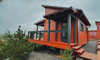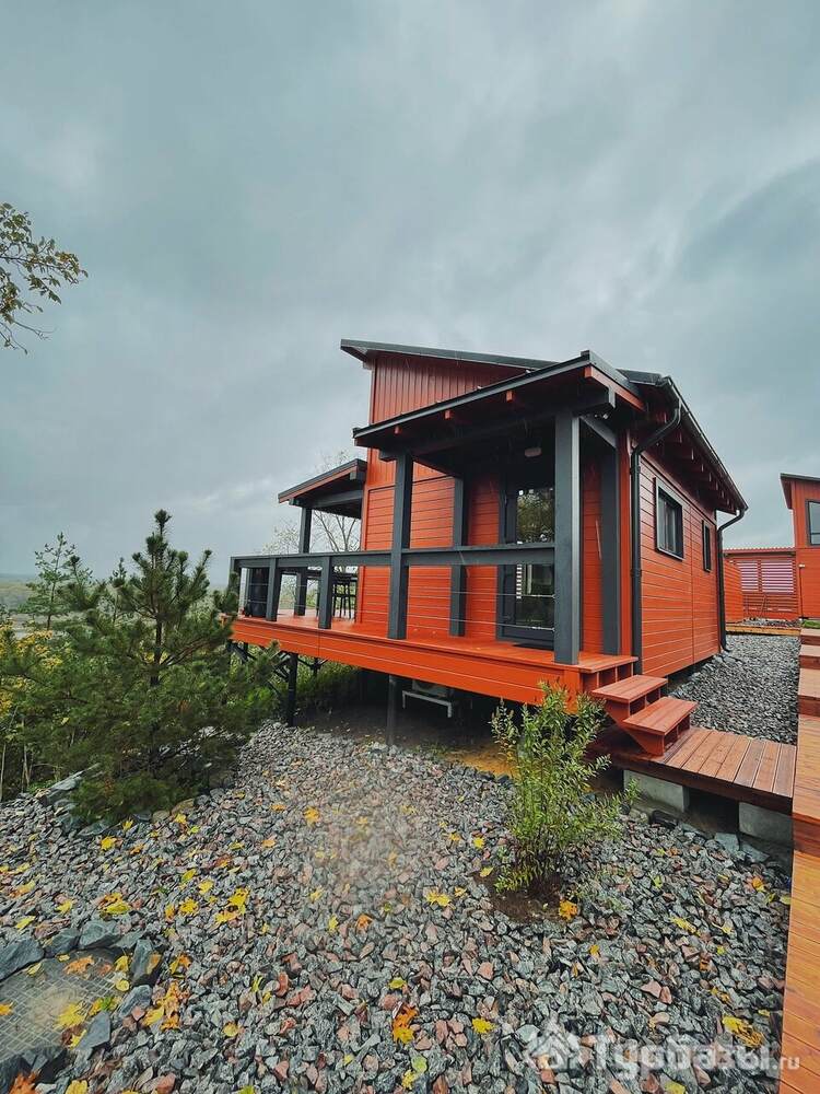 На территории комплекса размещено четыре автономных домика, каждый из которых имеет собственное пространство и виды на окружающую природу. Дома рассчитаны на разные форматы отдыха — от уютных вариантов для пары до более просторных домиков для небольшой семьи. Все постройки устроены с удобствами: есть полностью оборудованные кухни, гостиные зоны, спальные места, душевые и санузлы внутри.